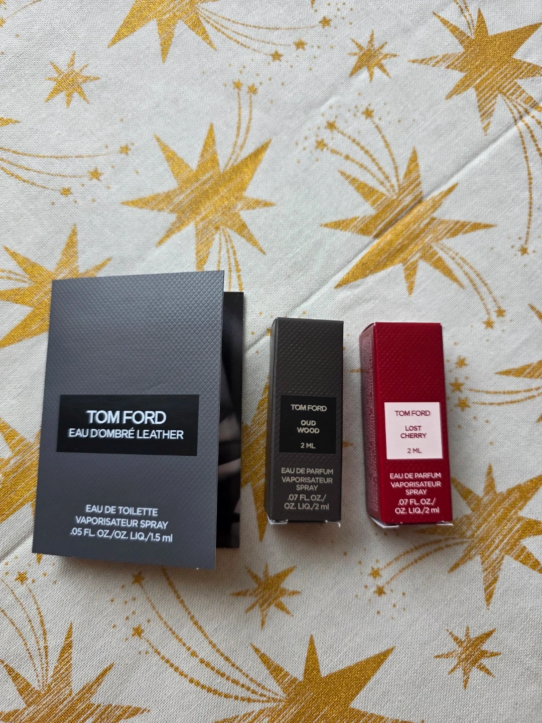 Includes three Tom Ford fragrance samples: Eau D Ombre Leather 1.5 ml, Oud Wood Eau de Parfum 2 ml, and Lost Cherry Eau de Parfum 2 ml. Perfect for trying out new scents!