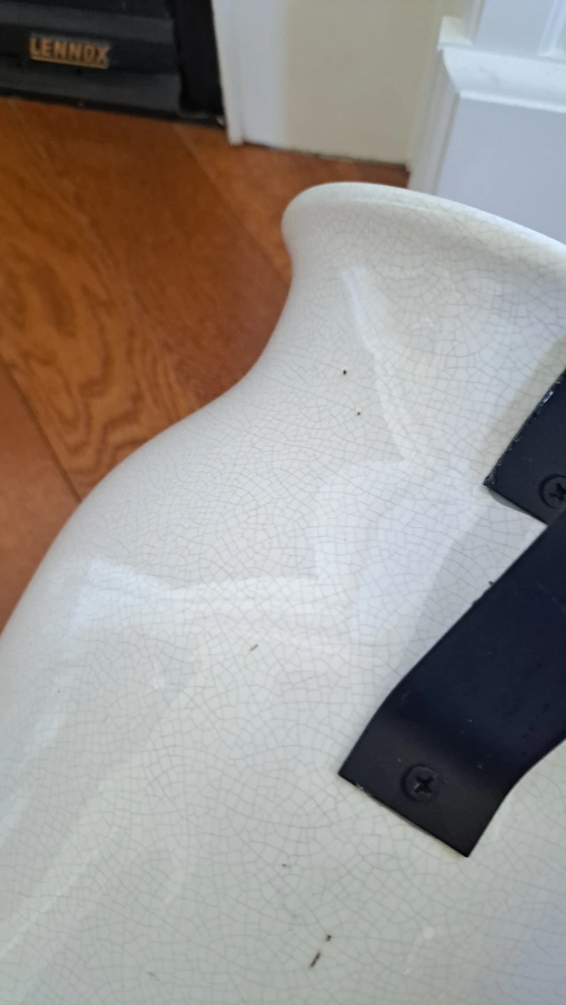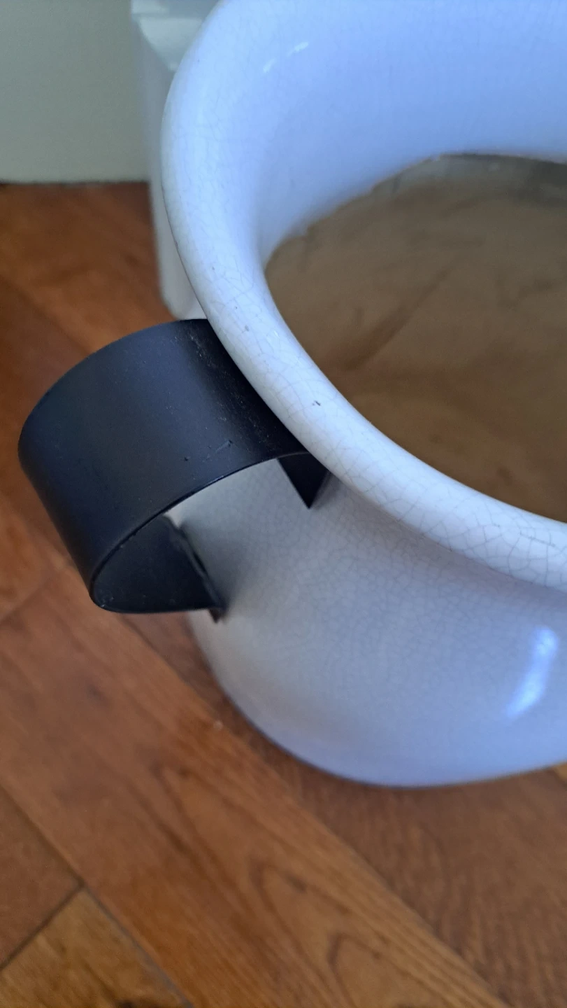 A lovely white ceramic pot with a decorative crackle glaze finish. It features sturdy black metal handles for easy carrying. Perfect for your favourite indoor plant!