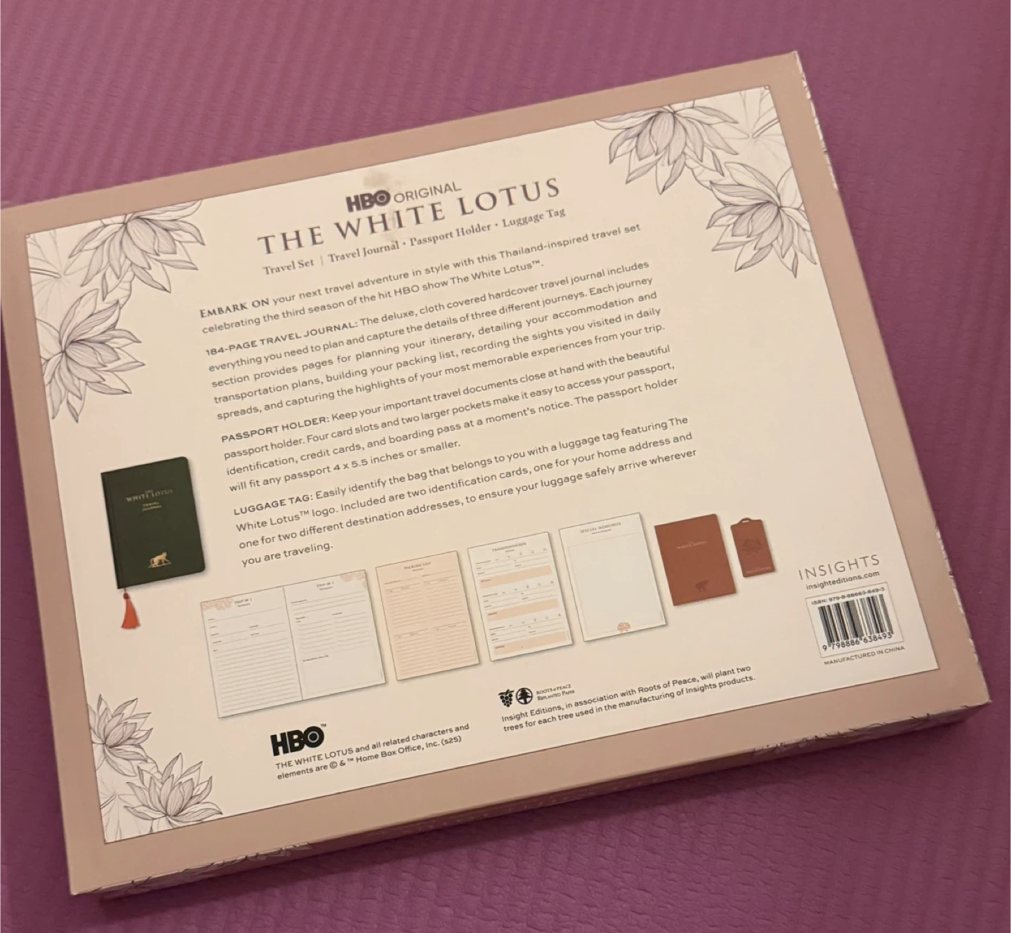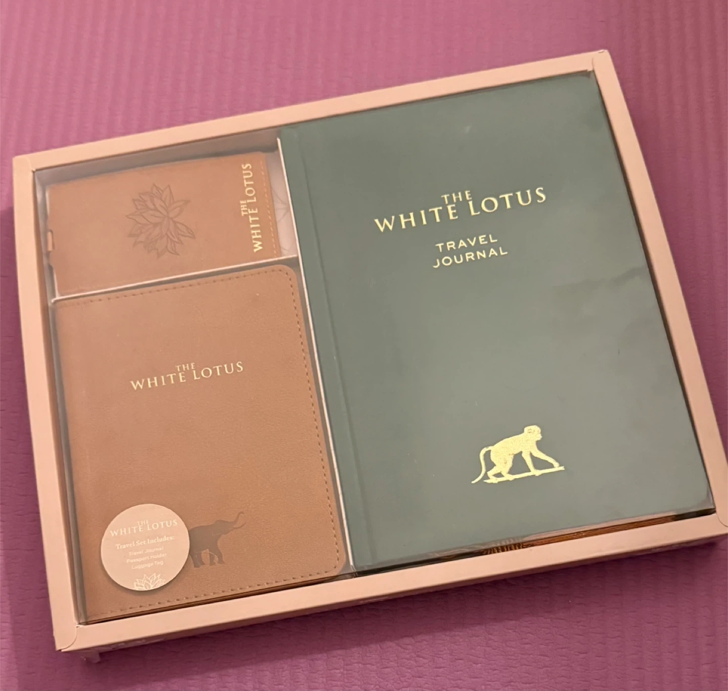 [✨NEW✨]The White Lotus travel set includes a 184-page travel journal, a passport holder, and a luggage tag. The journal has sections for trip planning and documenting experiences. The passport holder has four card slots and two larger pockets. The luggage tag features The White Lotus logo.