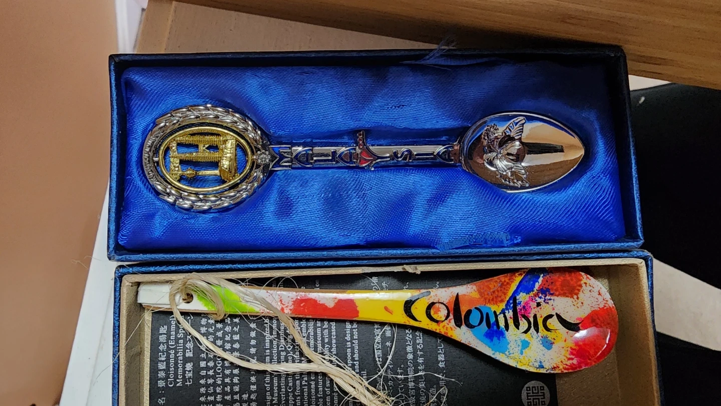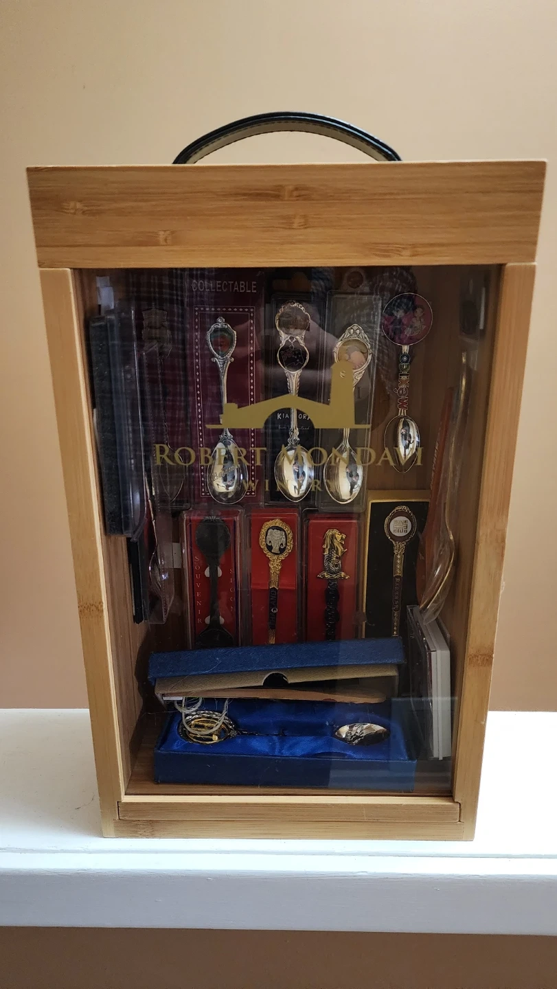 A bamboo display case filled with various collectible souvenir spoons. It includes spoons from different locations like Colombia, Malaysia, Japan, and more. Spoons are in individual packaging or presentation boxes.