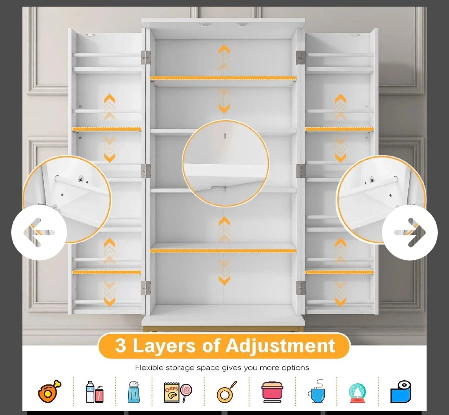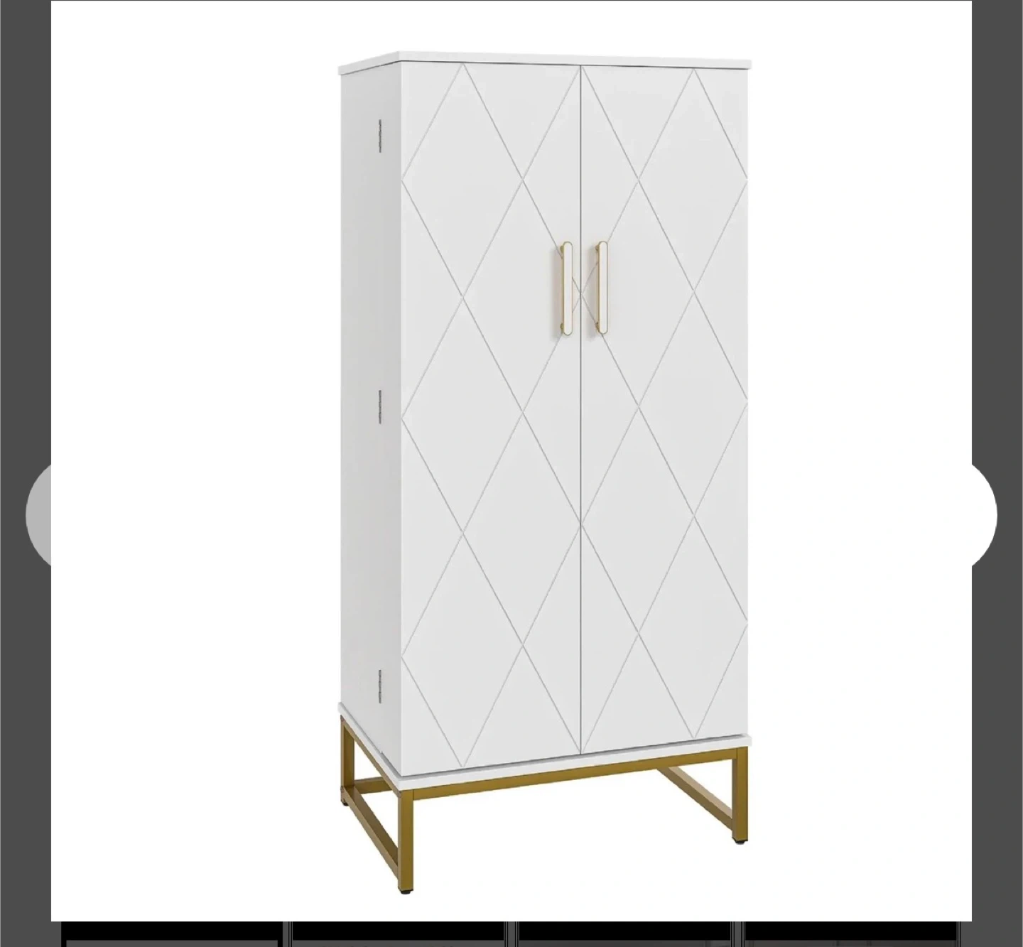 A 51-inch tall kitchen pantry cabinet in white with a diamond-patterned door design and gold accents. It features adjustable shelves with three layers of adjustment for flexible storage. External dimensions are 23.62" W x 15.75" D x 51.38" H.