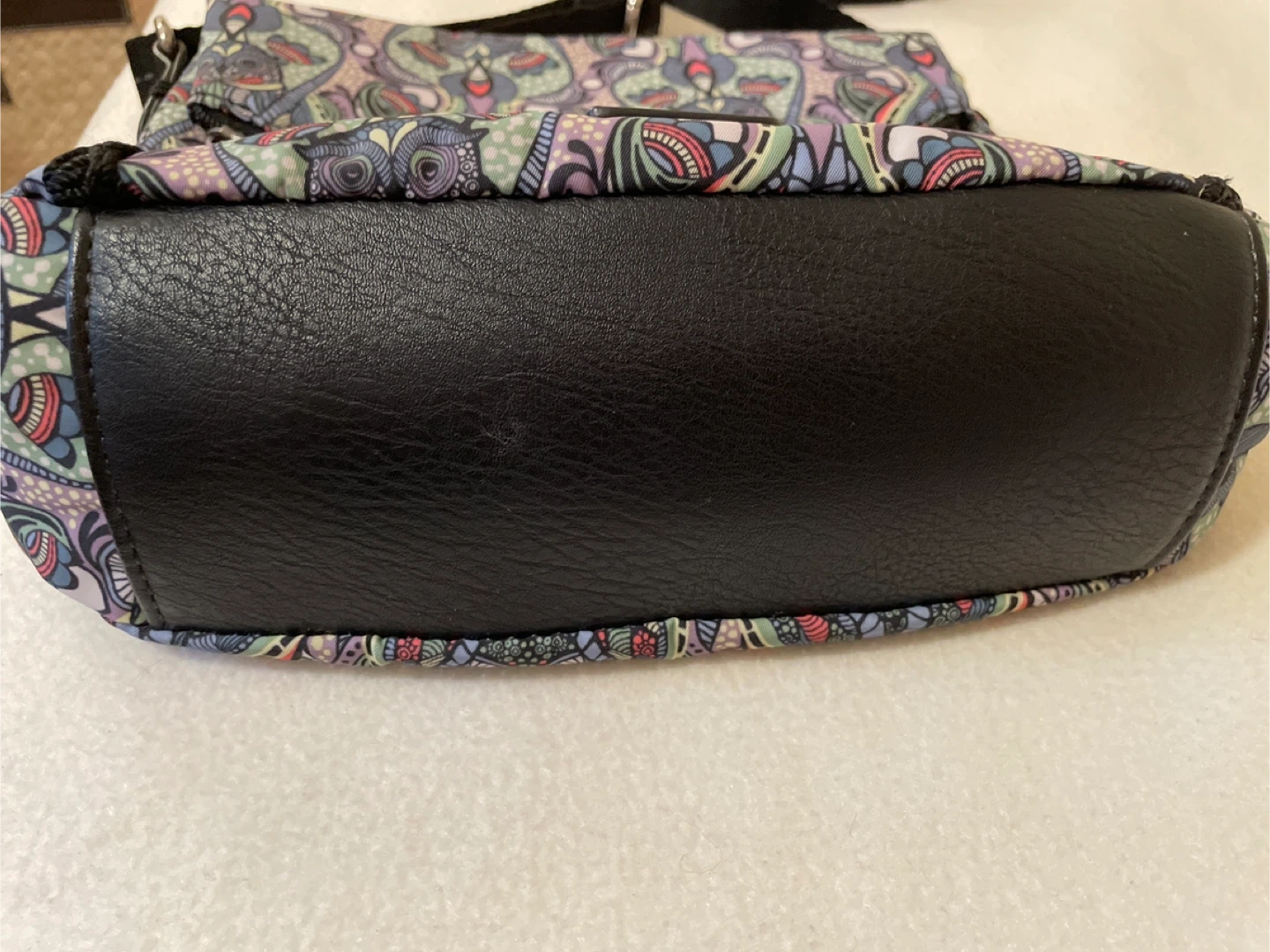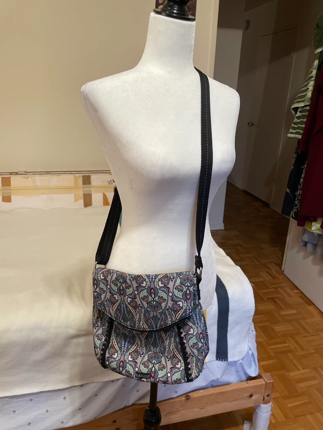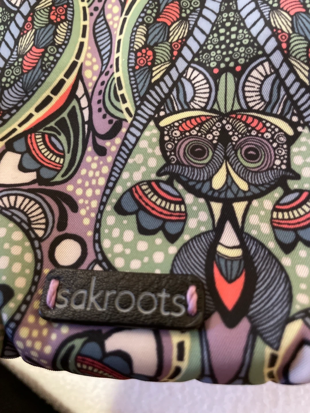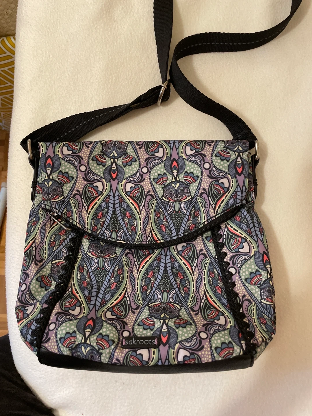 This Sakroots crossbody bag features a fun, colourful owl-themed pattern. It has a durable black base and a black adjustable strap. It's a great size for everyday essentials!
