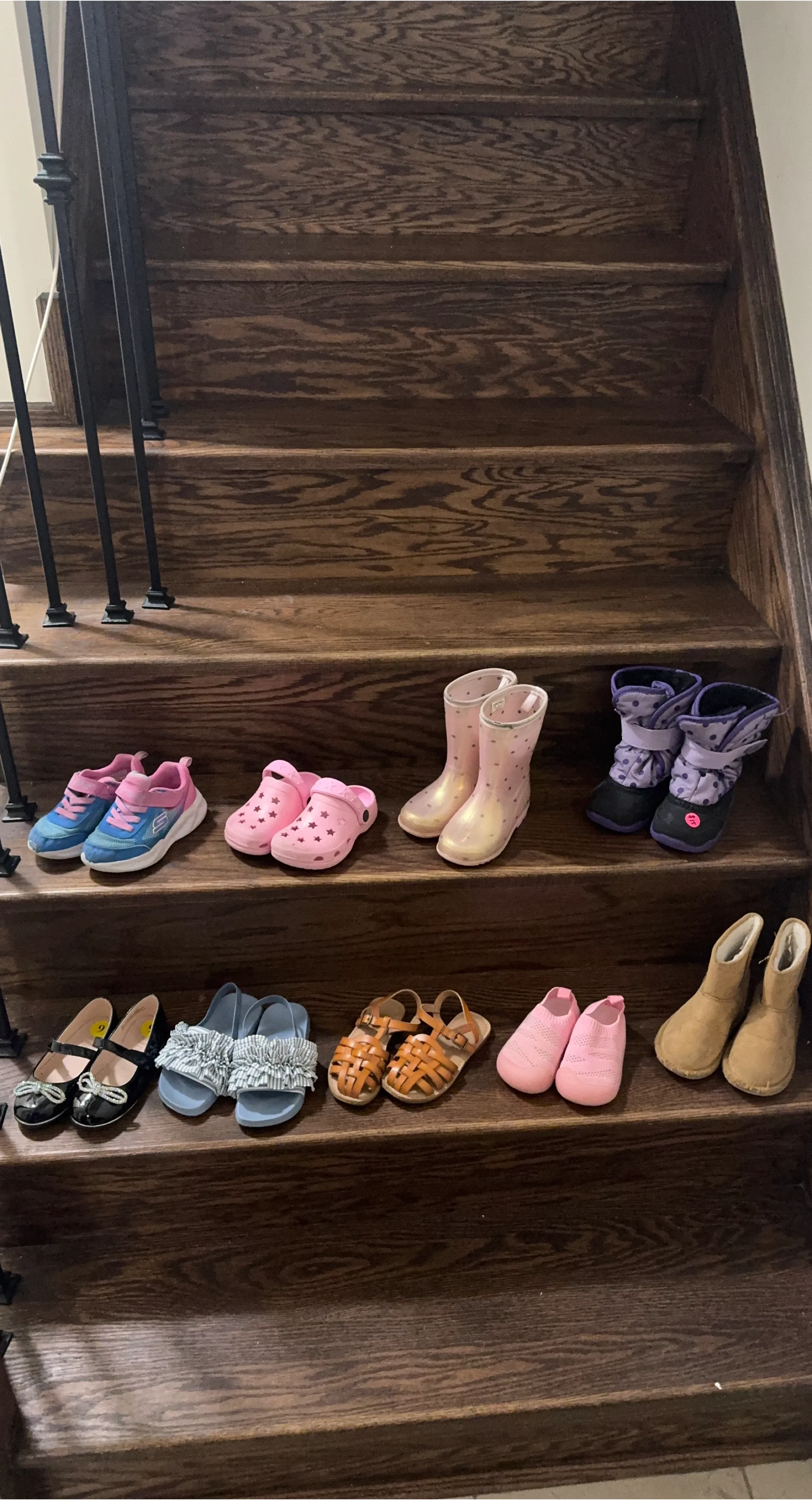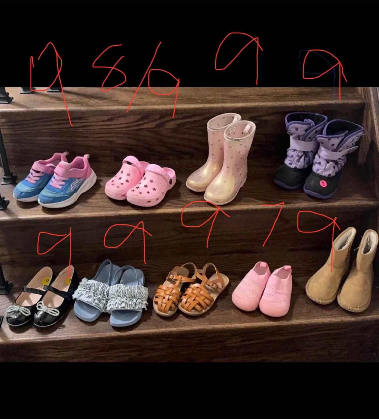 This is a collection of assorted girls' footwear. Includes ballet flats, sandals, sneakers, and boots. Sizes and brands vary across the collection.