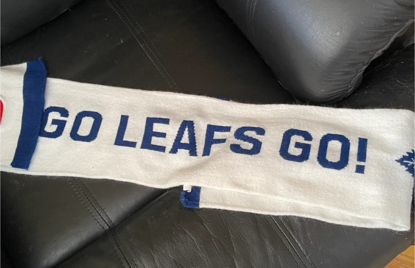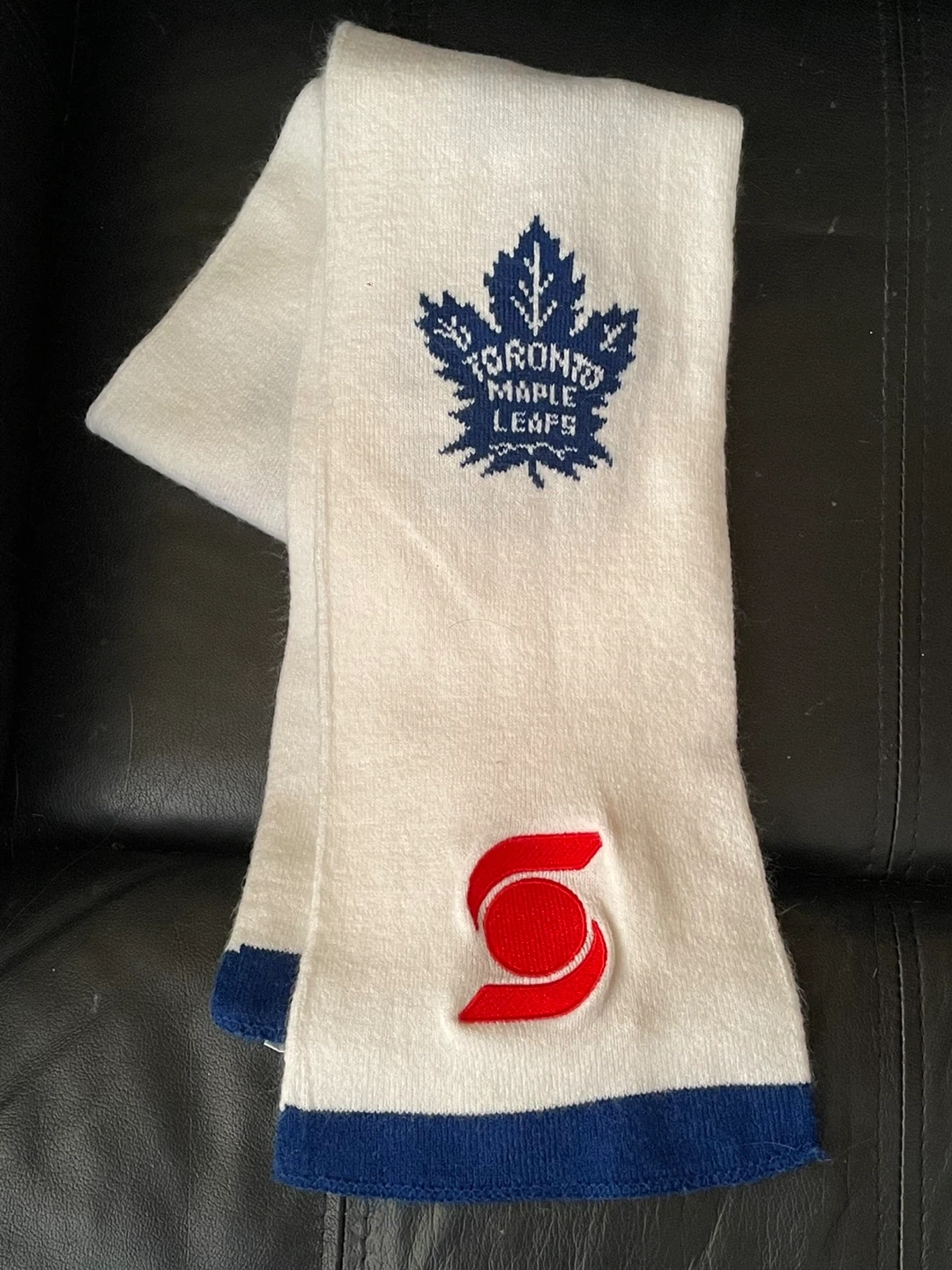White knitted scarf with blue Toronto Maple Leafs logo and "GO LEAFS GO!" text. Features a red and white "S" logo. Blue trim on ends. Perfect for showing your team spirit! Worn only a couple of times and recently washed.