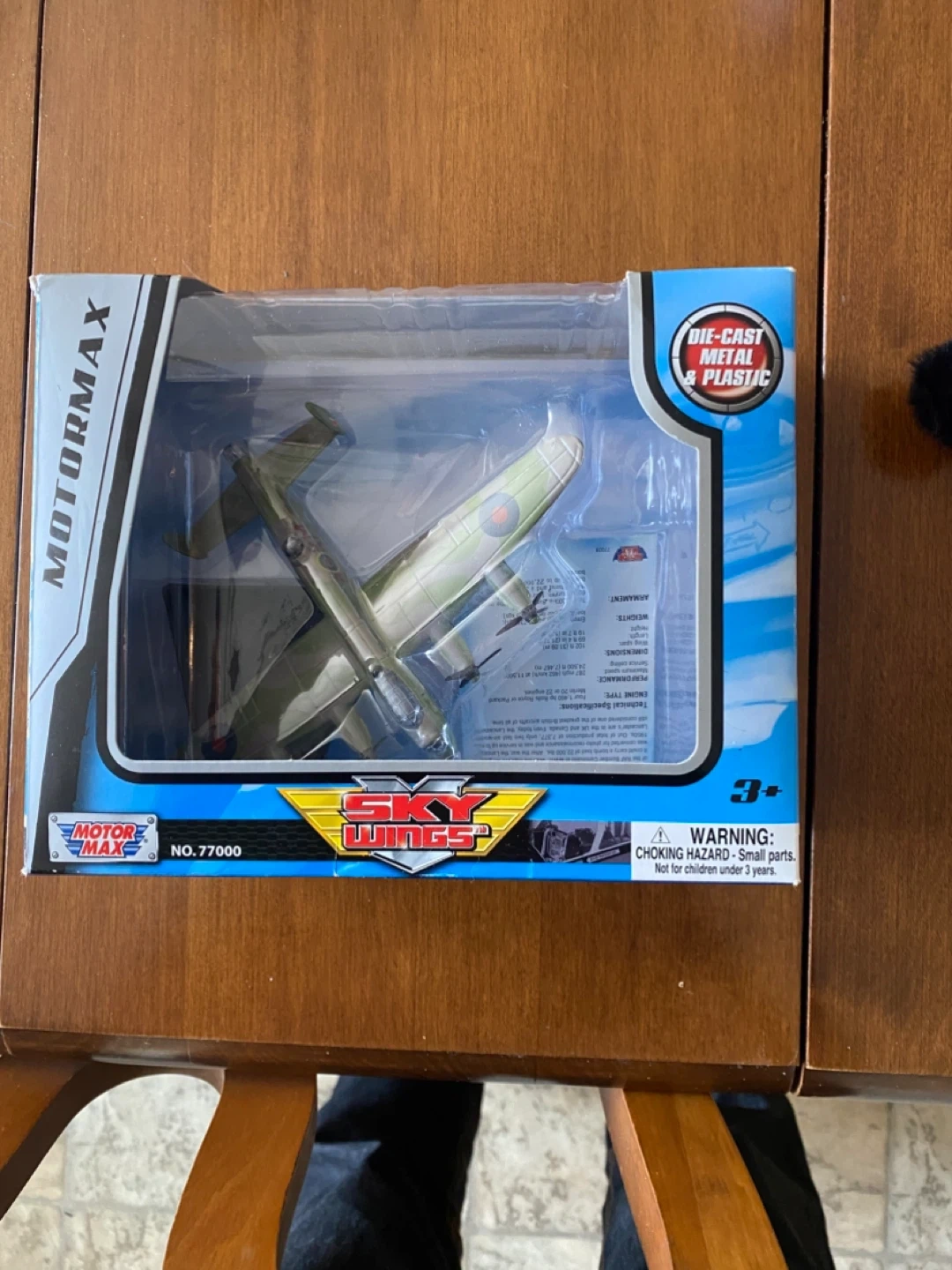 Selling a Motor Max Sky Wings die-cast metal and plastic airplane toy. The box indicates it's suitable for ages 3+ in original box unopened