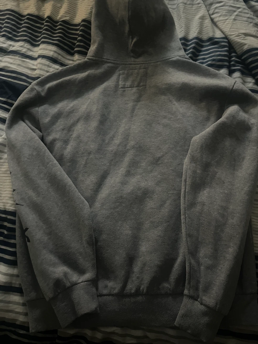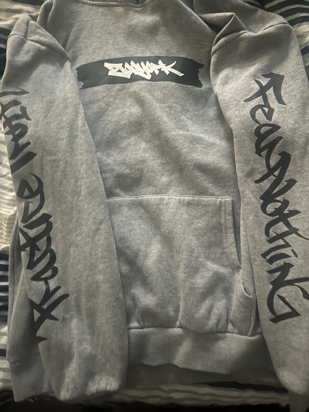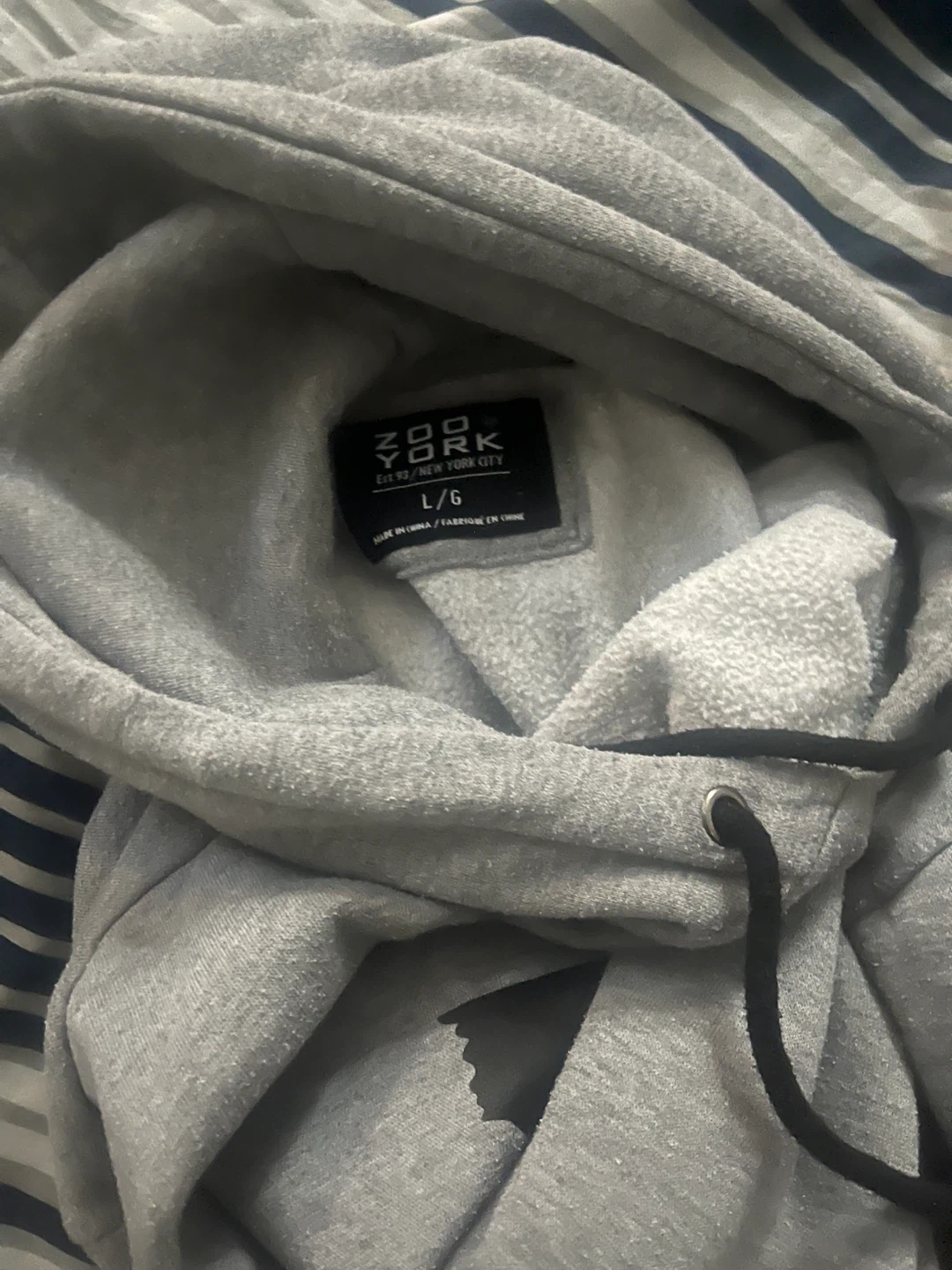 This grey Zoo York hoodie features graphic text on the sleeves and a front pocket. It's a size L/G. Great for casual wear!