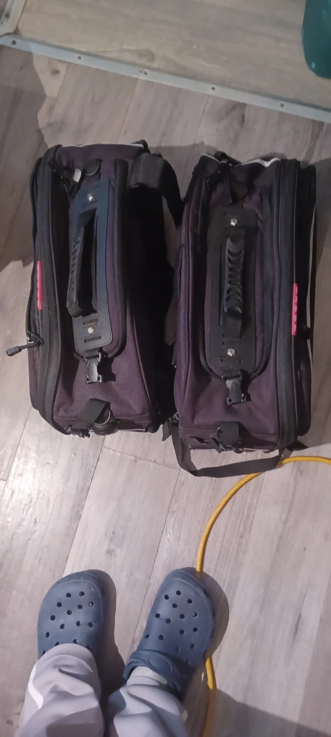 Set of two Niche brand motorcycle saddlebags. Black fabric construction with reflective silver trim. Includes mounting straps and zippers for closure. Great for carrying gear on rides! Rain covers included... used maybe 4 times