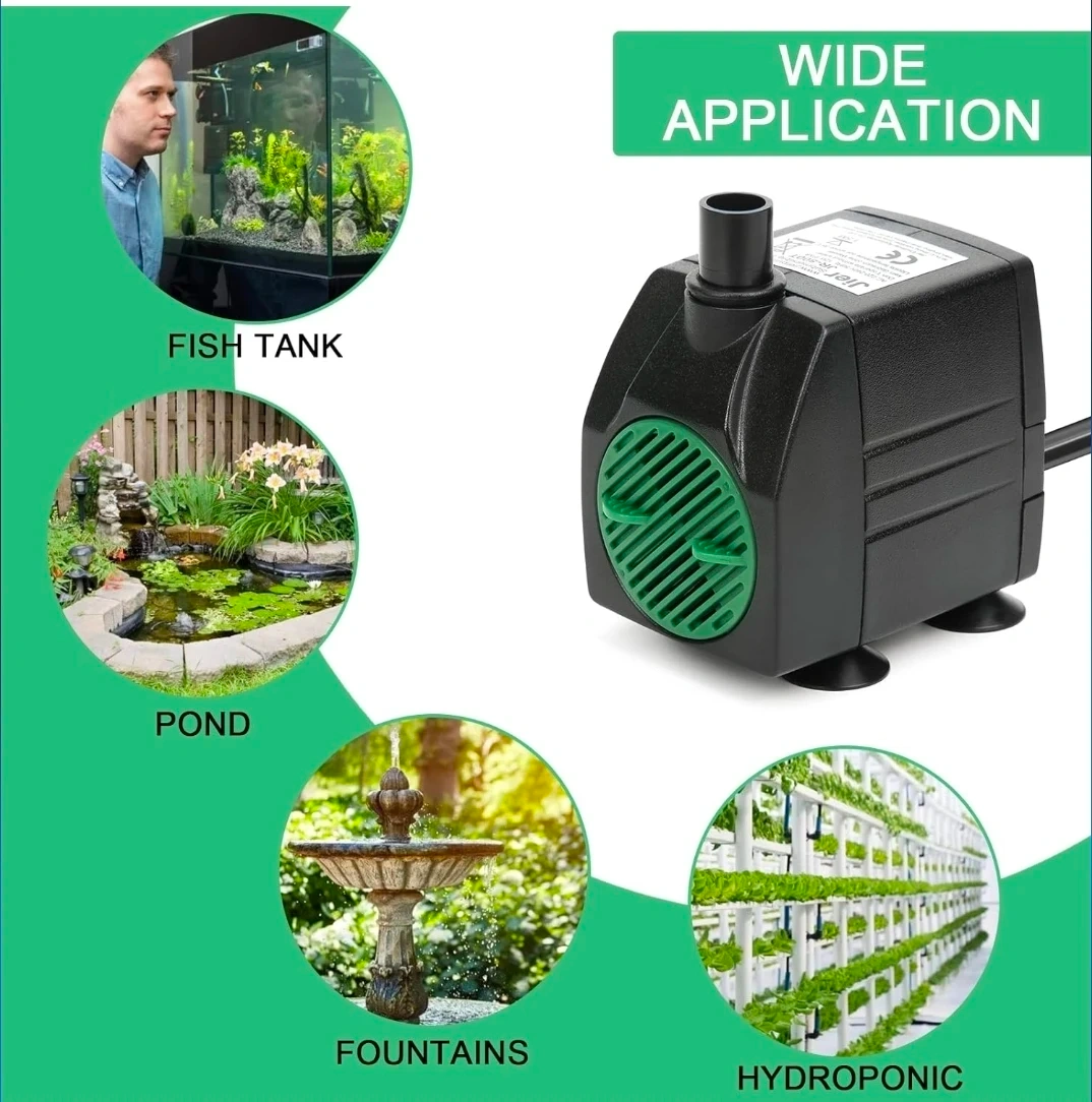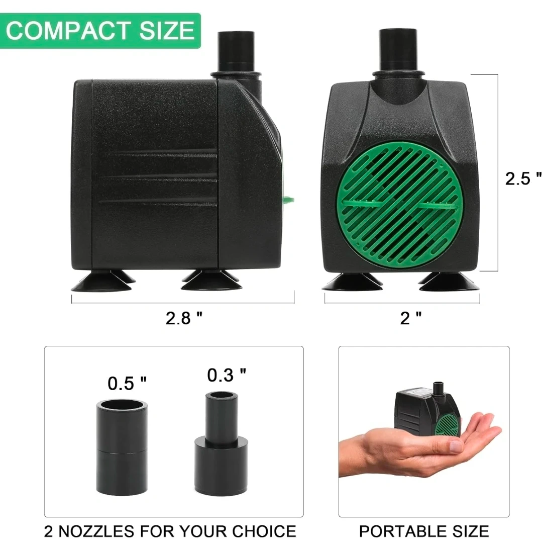 This is a compact and quiet submersible water pump from BARST. It's suitable for fish tanks, ponds, fountains, and hydroponics. The pump comes with two nozzles for your choice. It's detachable and easy to clean.