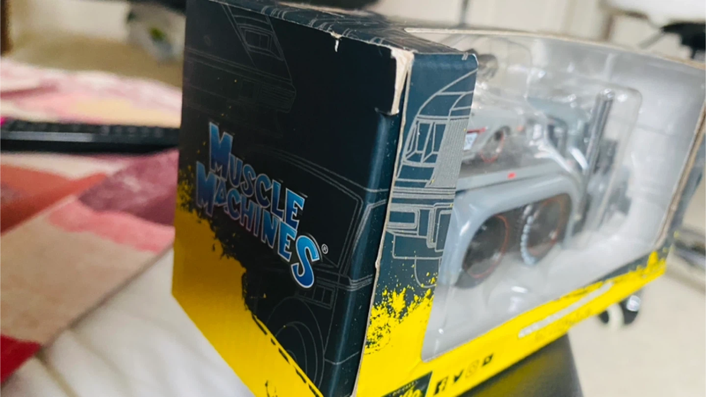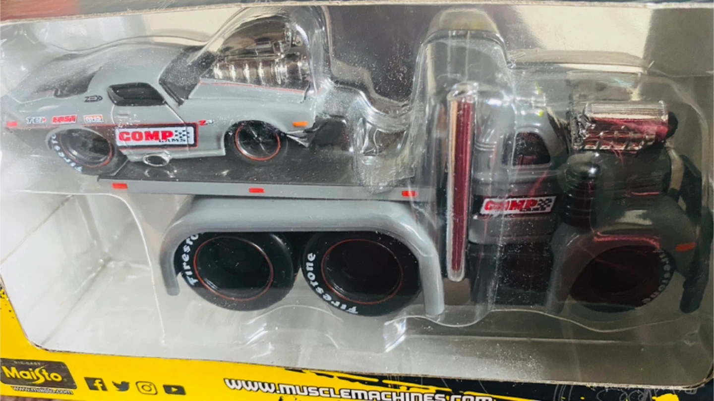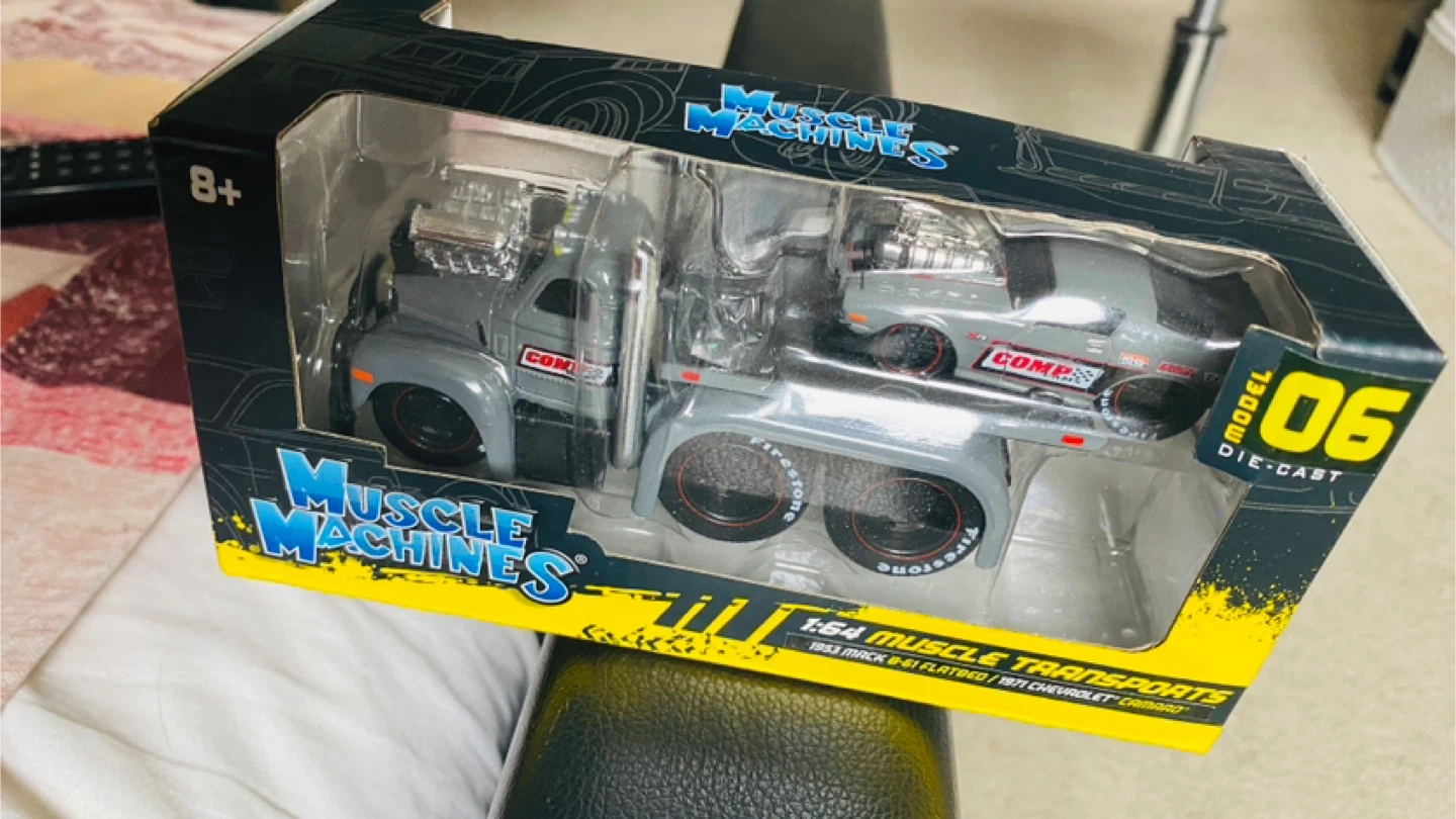 This is a 1:64 scale Muscle Machines die-cast set featuring a flatbed truck and a 1971 Chevrolet Camaro. The truck is a Mack B-61 model and the set is part of the Muscle Transports series. It's suitable for ages 8 and up. New, never opened.