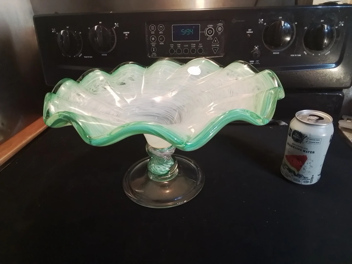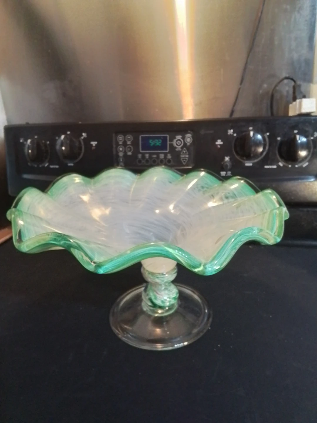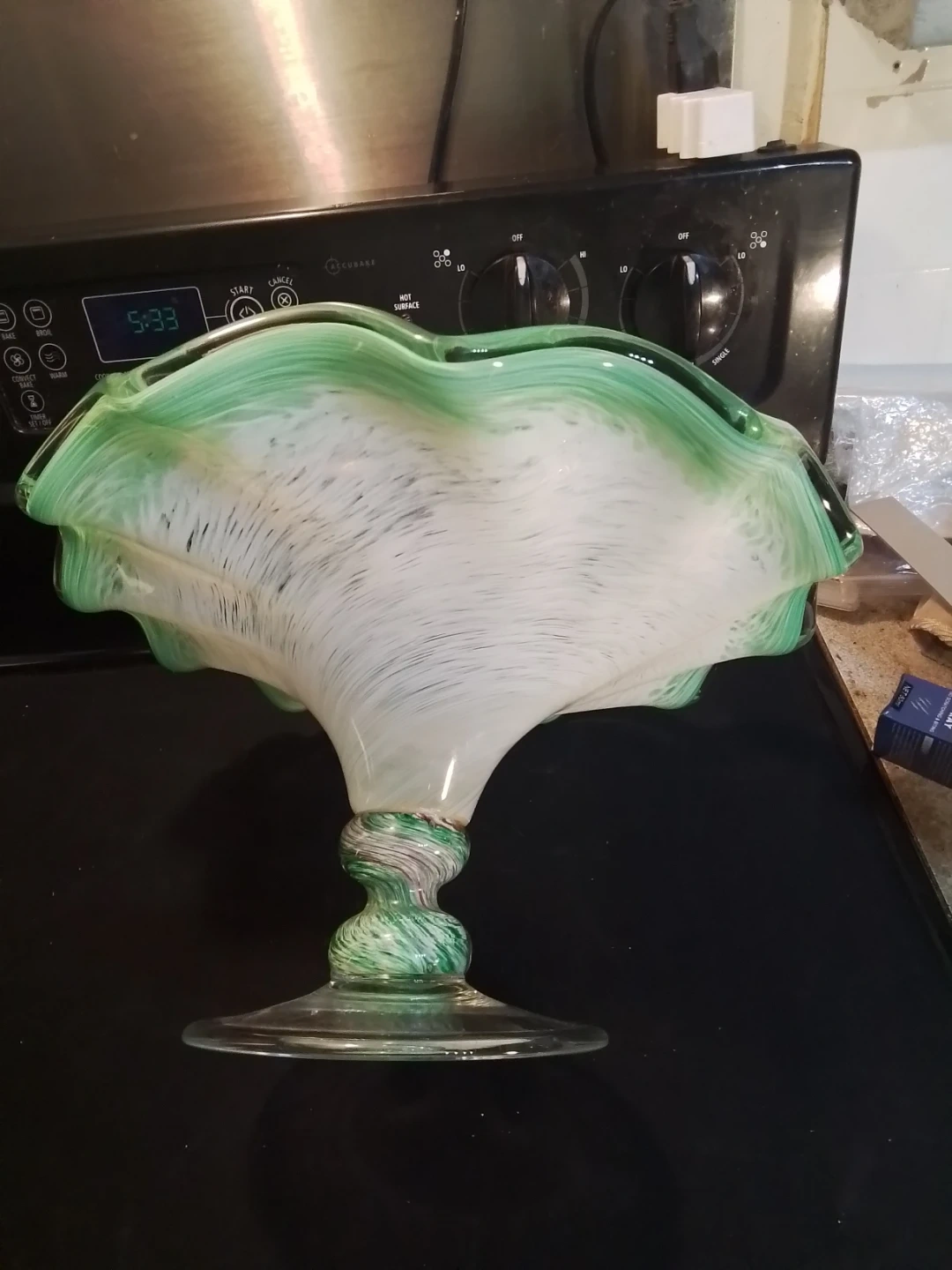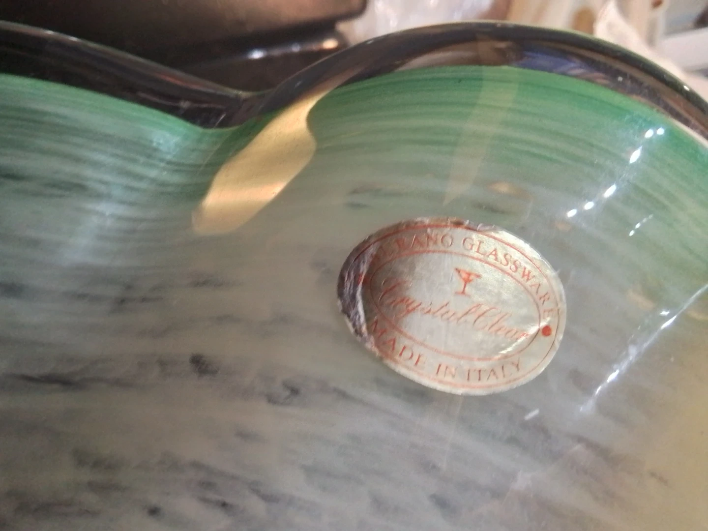 Add a touch of vintage elegance to your home with this large Murano art glass compote bowl, showcasing beautiful green and white swirls! This striking piece measures 13 inches in diameter and stands 7 inches tall, making it a substantial decorative item. While it's a used piece, its unique design and signed craftsmanship bring character to any display.