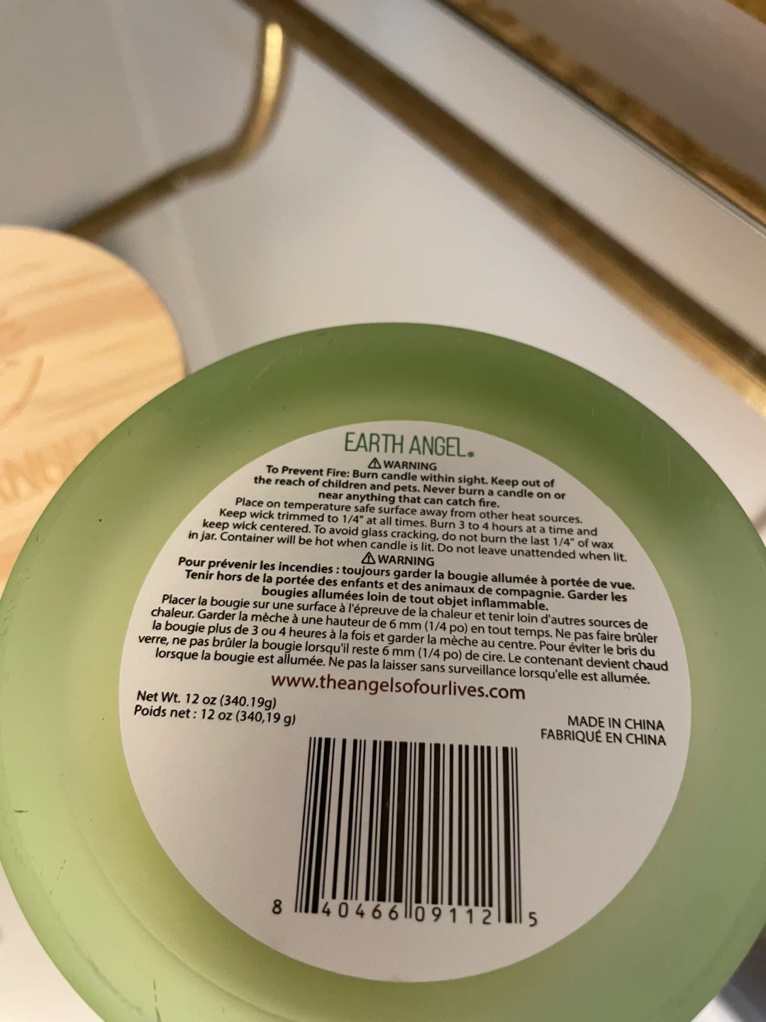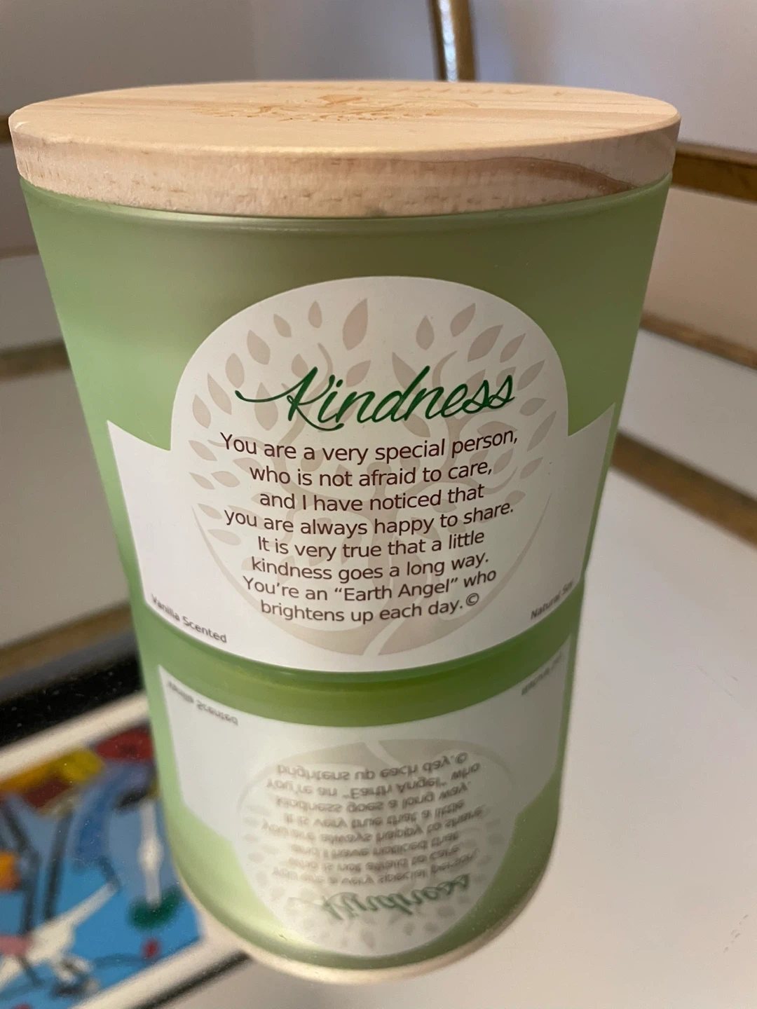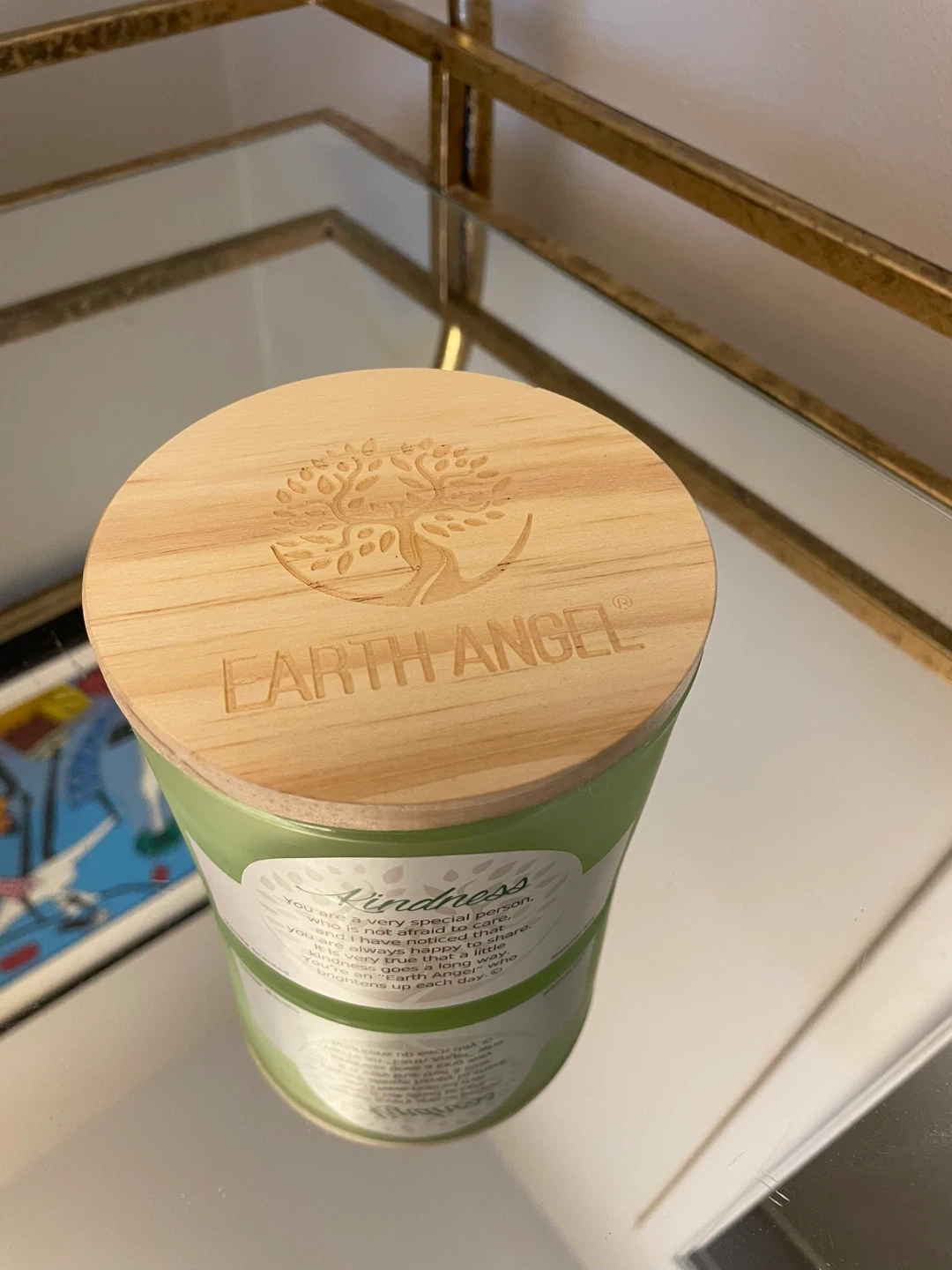 This Earth Angel candle is vanilla scented and features a wooden lid with the Earth Angel logo. The candle has a label that reads "Kindness" with a sweet message. It's a natural size and comes with its original box. The net weight is 12 oz (340.19g)