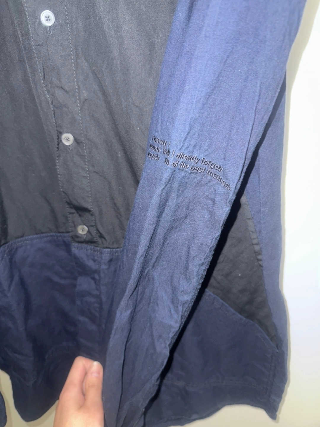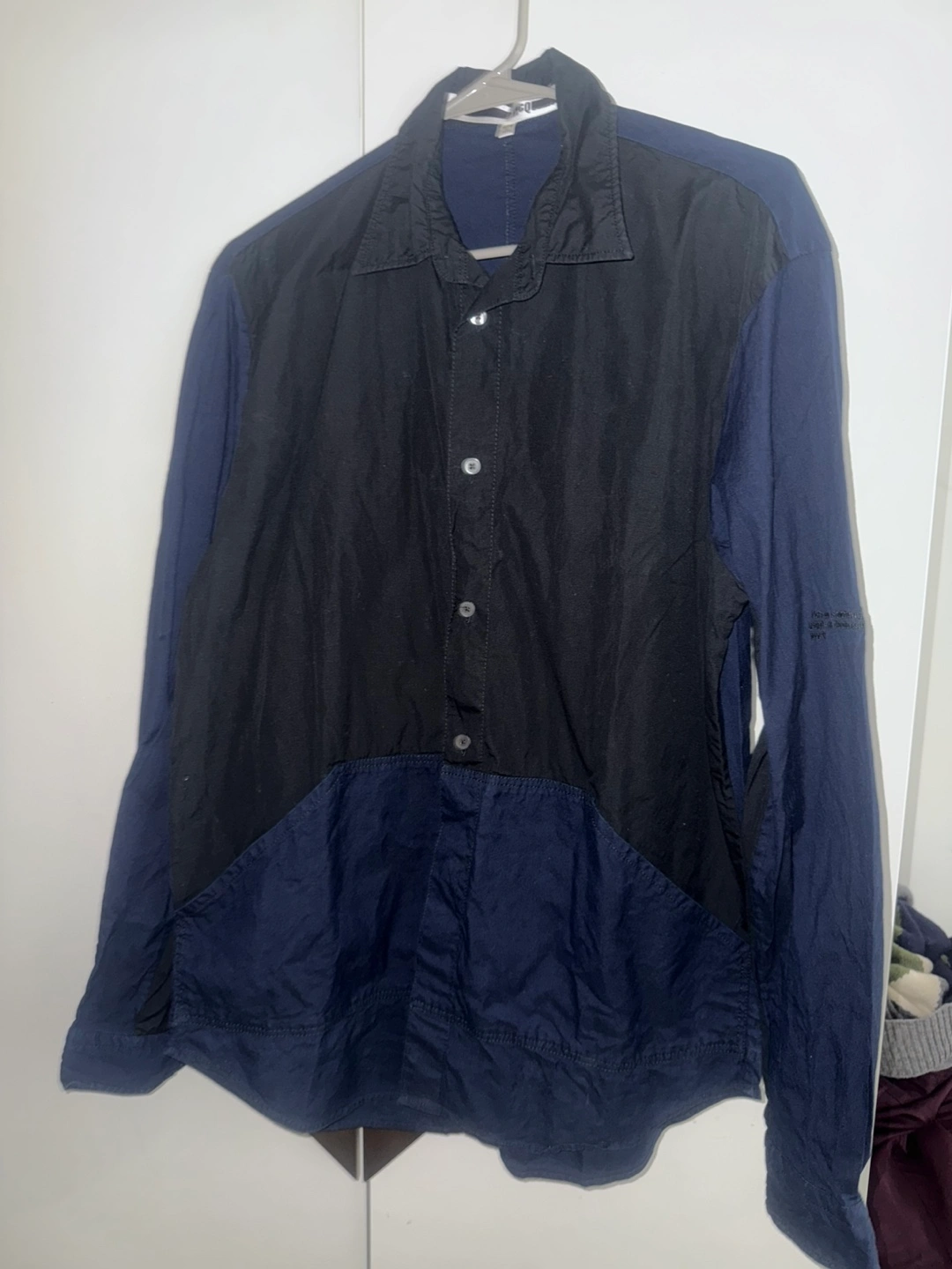 a stylish two-tone button-down shirt in black and dark navy blue! It's a unique piece with a cool design from MCQ (sub line of Alexander McQueen). The shirt features a combination of black and blue panels, giving it a modern and eye-catching look. Perfect for adding a touch of style to your wardrobe! Size US Men M
