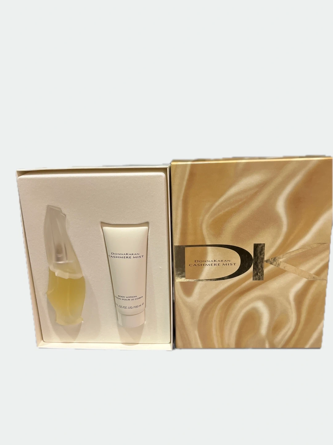 This gift set features Donna Karan Cashmere Mist Body Eau De Toilet Spray 50ml . It includes a 100ml bottle of body lotion. The set comes in its original packaging.