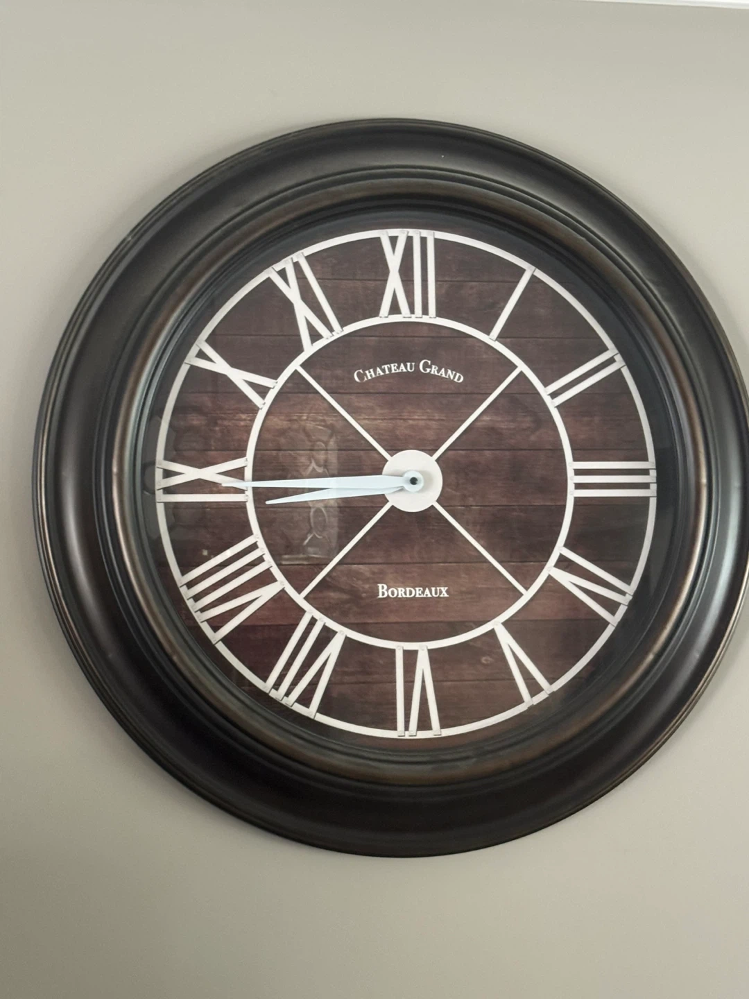 Large wall clock with a dark wood-look face and Roman numerals. It features a dark, ornate frame. Timepiece for your home or office.