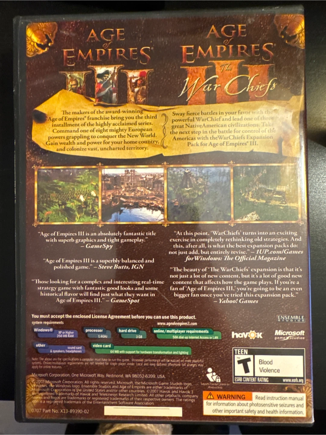 Selling Age of Empires III Gold Edition for PC! This includes the original game and the War Chiefs expansion pack. Game keys included inside, and all 4 discs are in good condition.