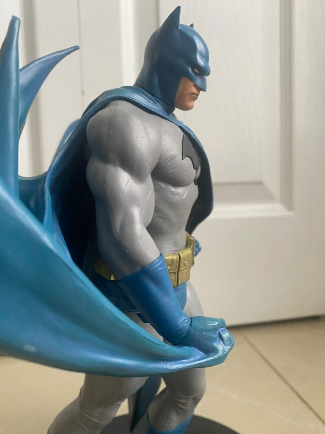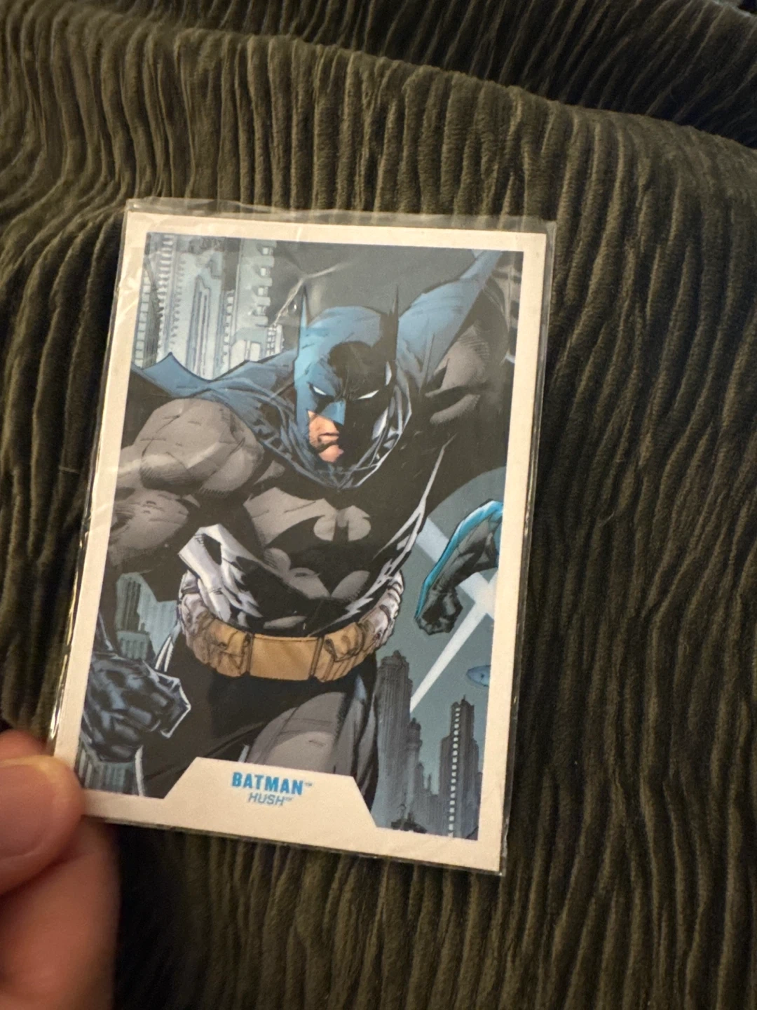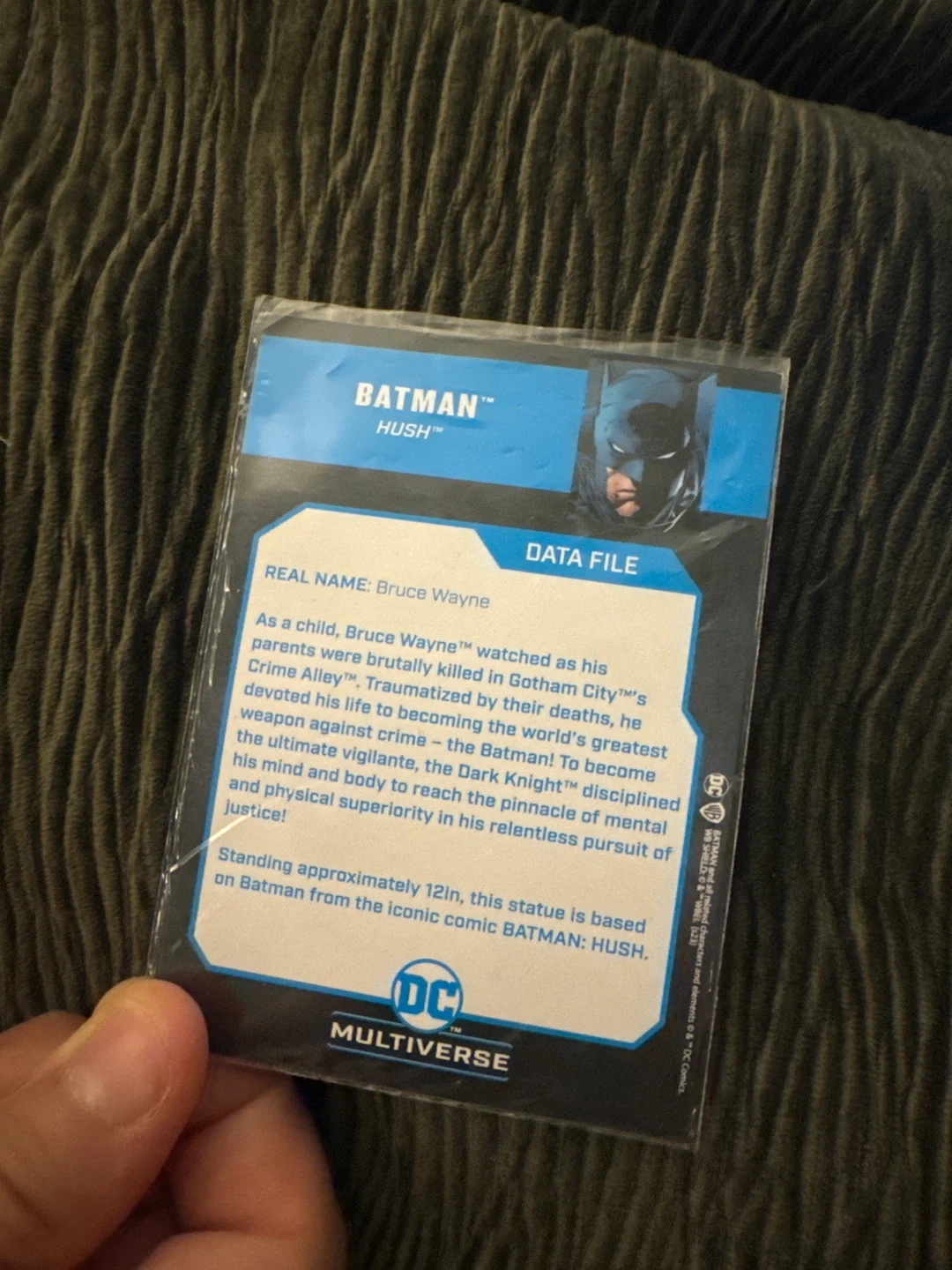 This Batman action figure displays the Caped Crusader in his iconic blue and grey suit with a flowing cape. It includes a collectible card featuring "Batman Hush". The figure stands on a black display base.