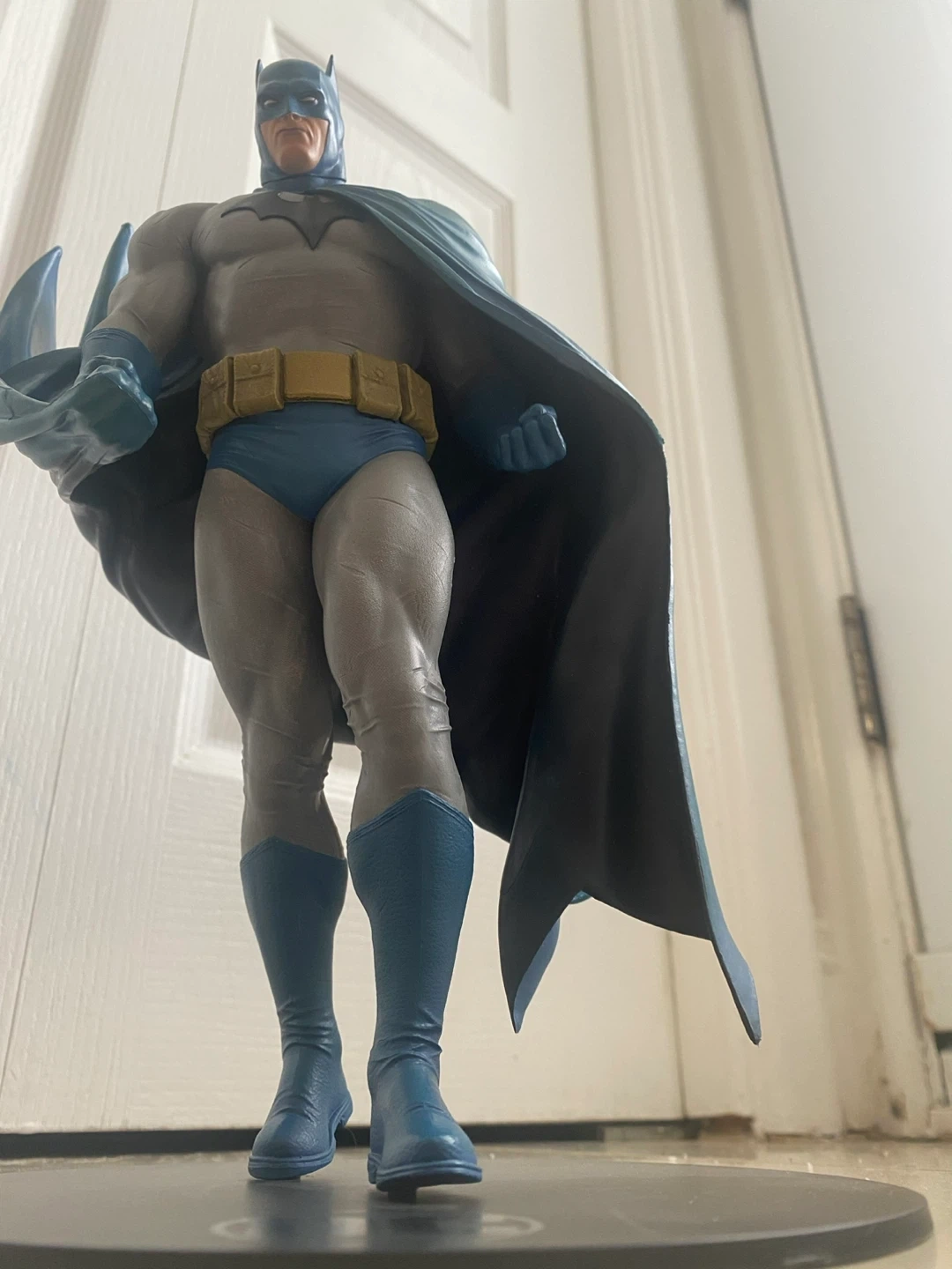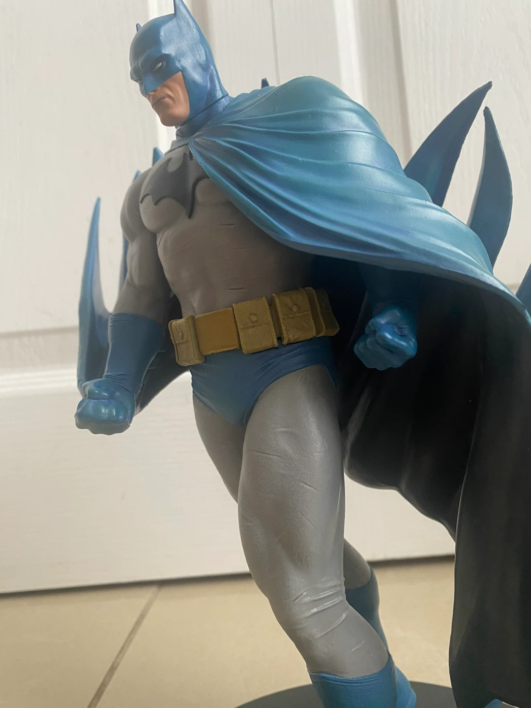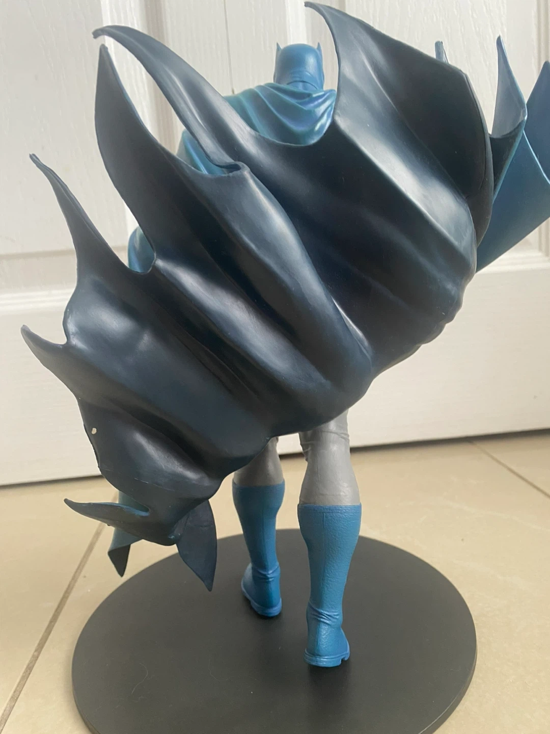 This Batman action figure displays the Caped Crusader in his iconic blue and grey suit with a flowing cape. It includes a collectible card featuring "Batman Hush". The figure stands on a black display base.