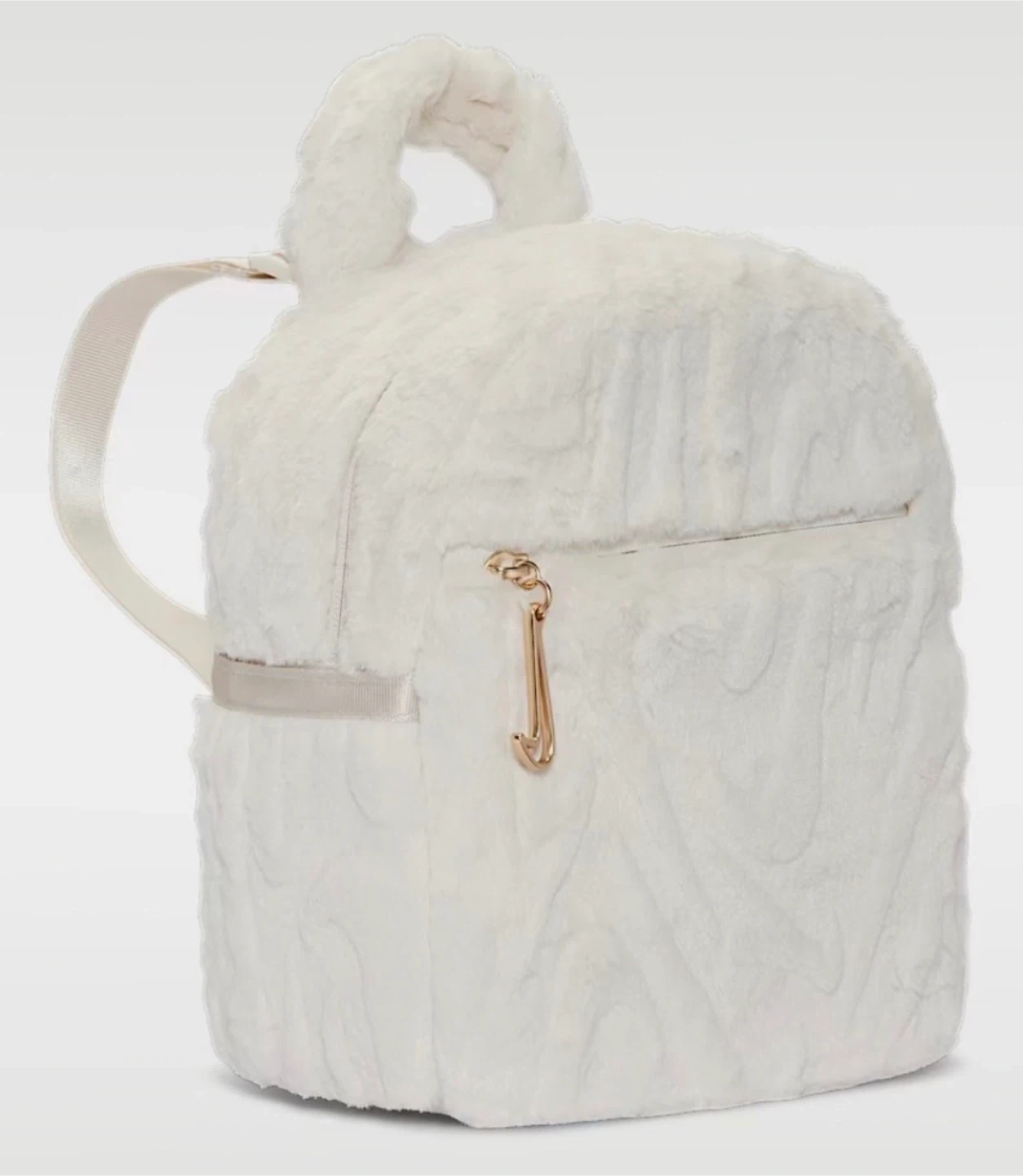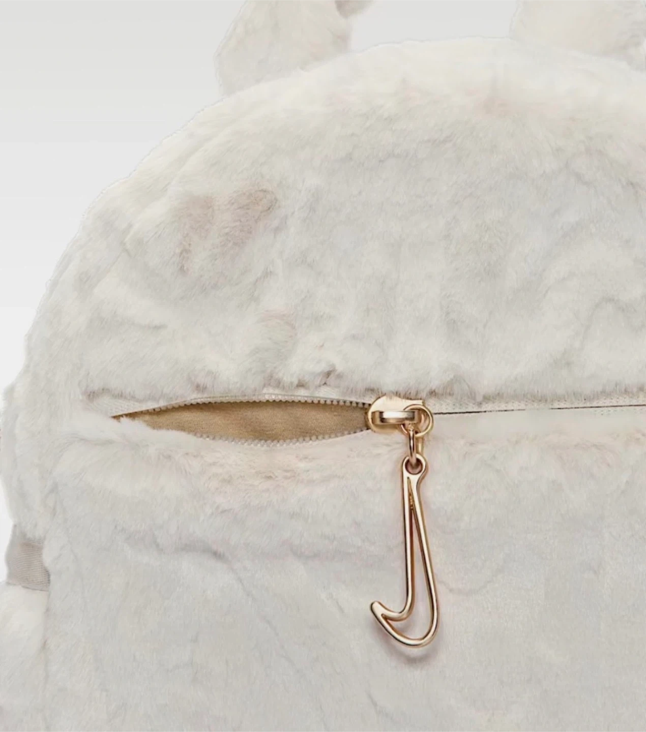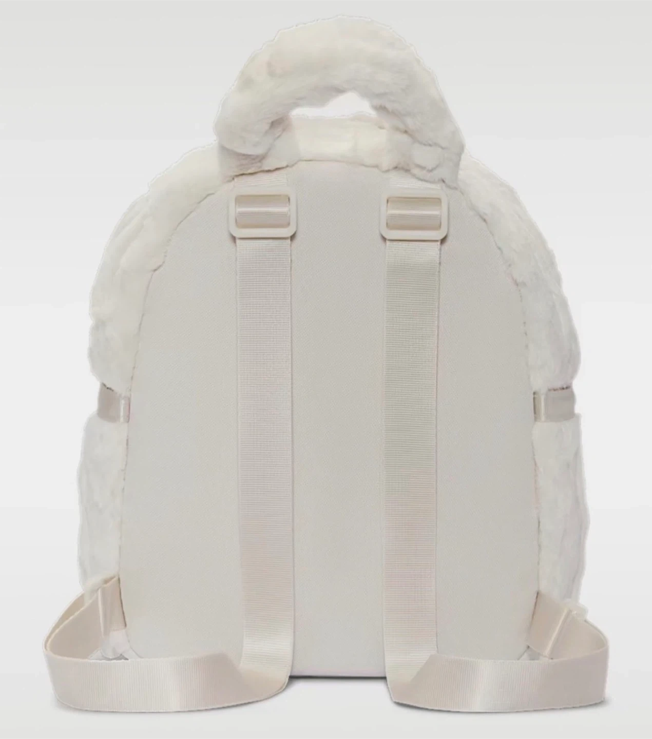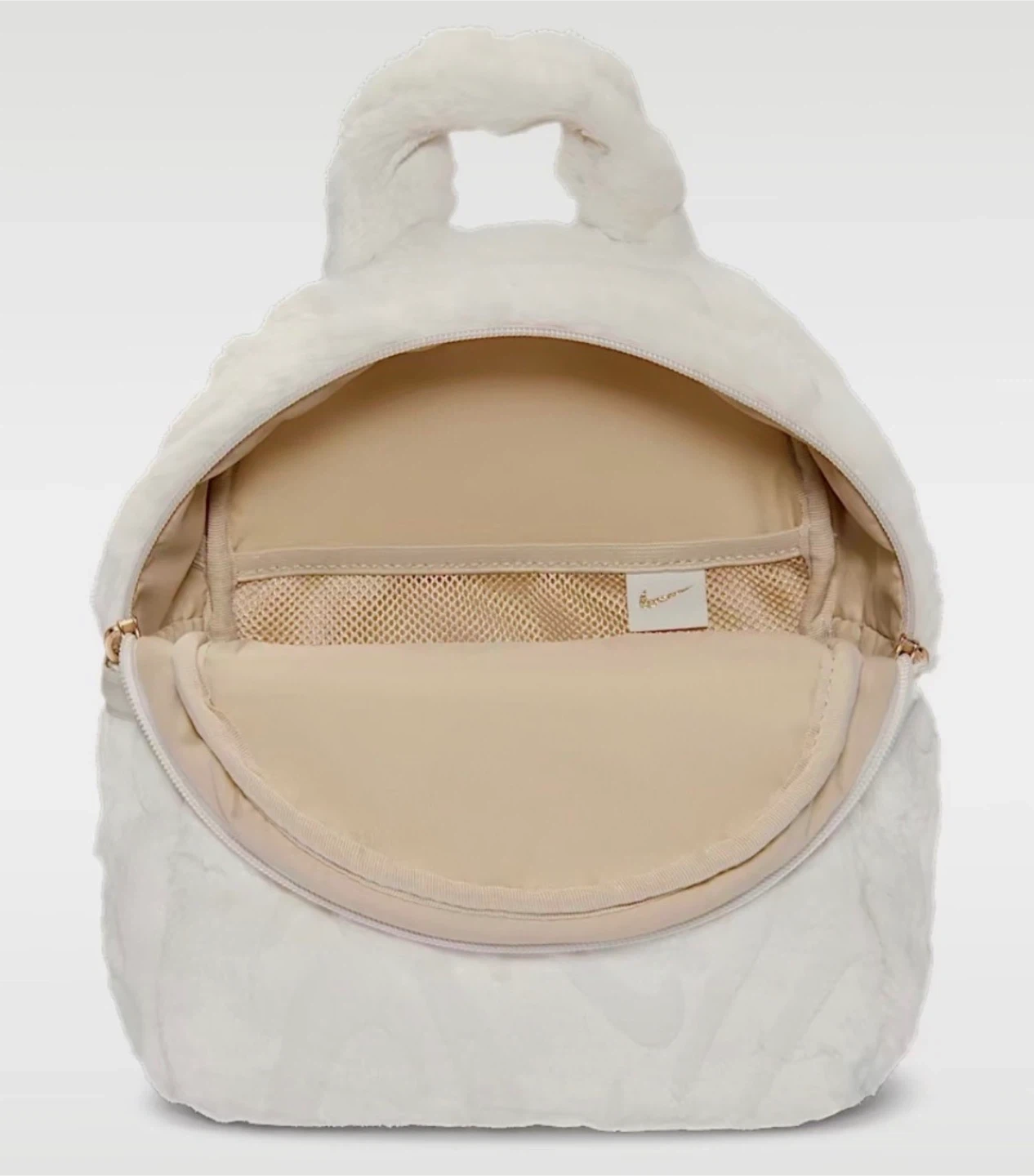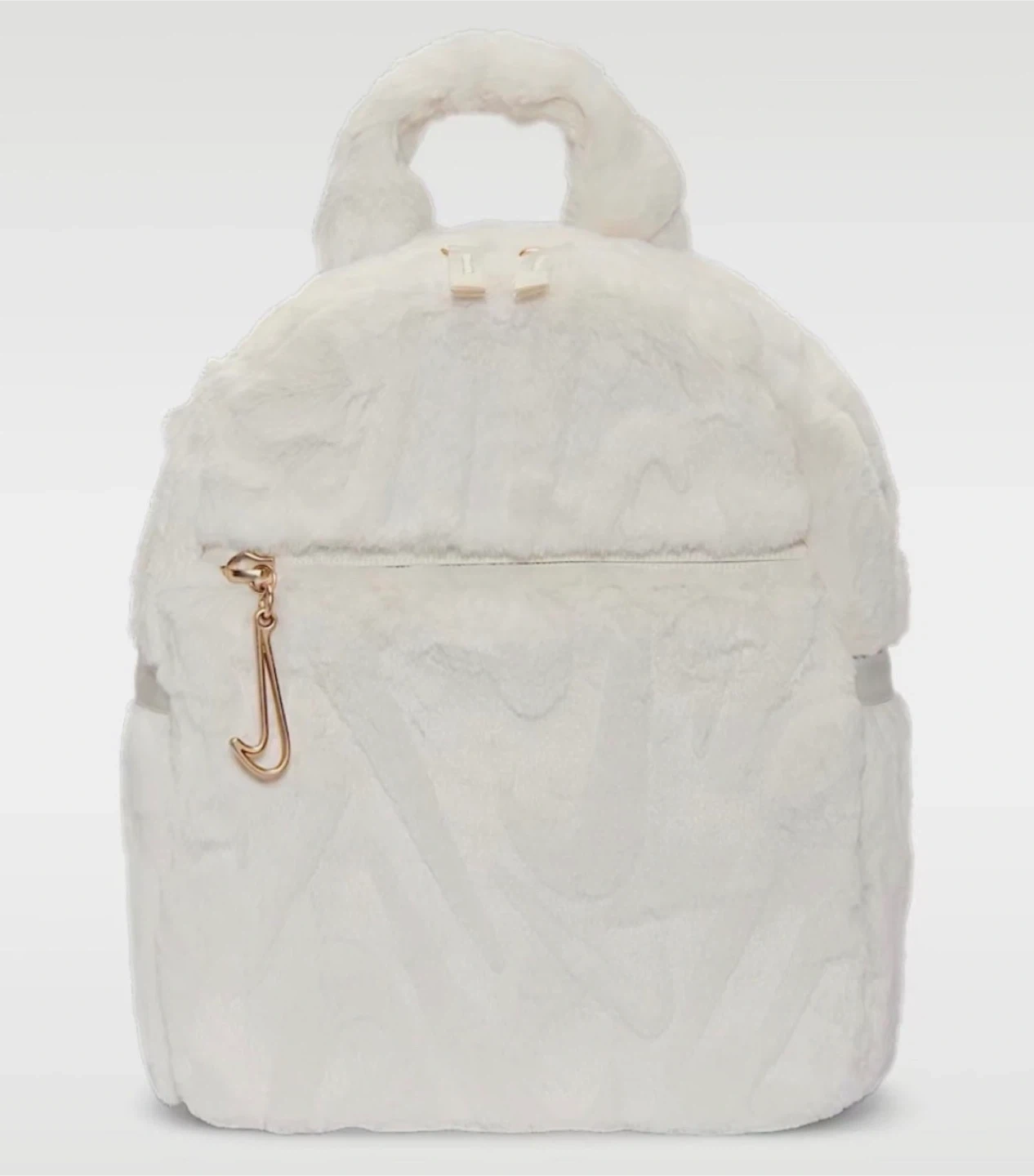 Super cute and fluffy white faux fur mini backpack by Nike. It has a main compartment with internal pockets and a front zippered pocket. The spacious 6-liter capacity is perfect for your essentials, while the additional polyester straps ensure your belongings stay secure and organized. Whether you're heading to the gym or running errands, this backpack is an ideal companion for your active lifestyle.