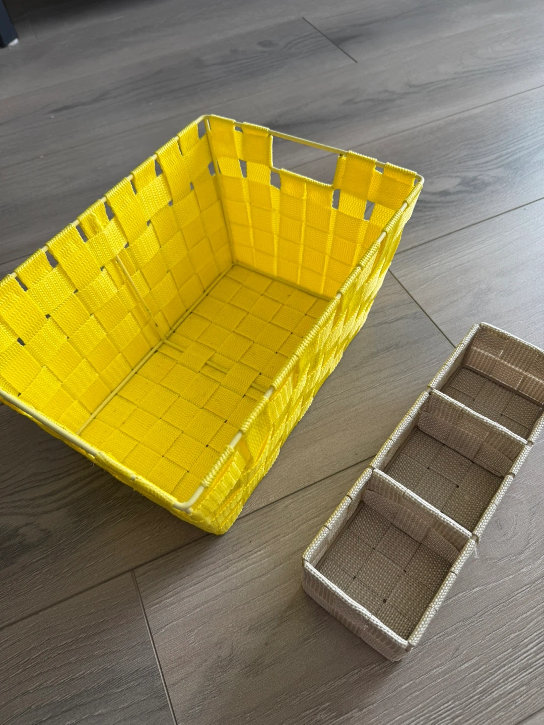 This set includes a bright yellow woven storage basket with a handle and a small beige organizer tray with three compartments. They're great for tidying up shelves or desks. Use the basket for larger items and the organizer for smaller accessories.