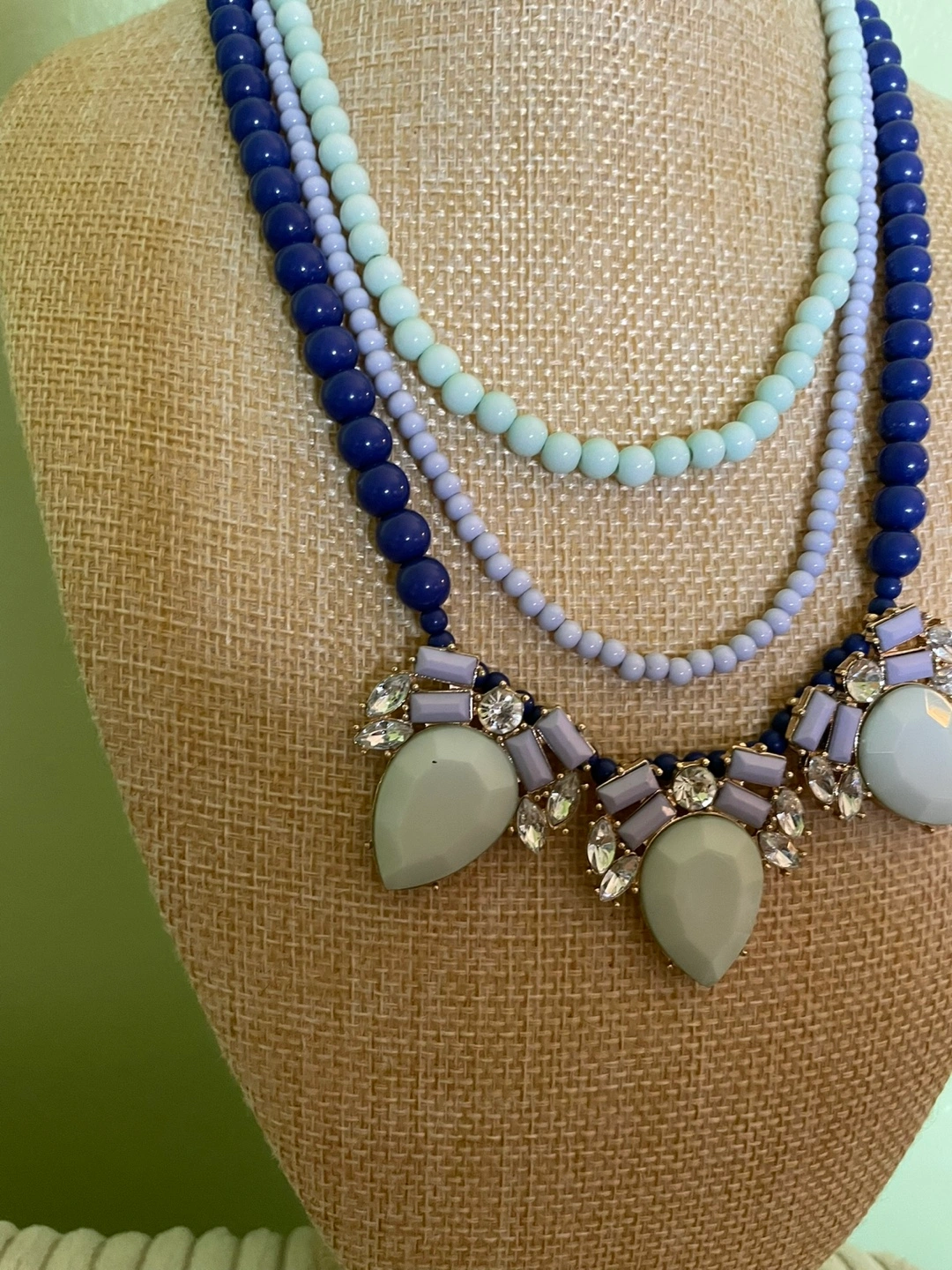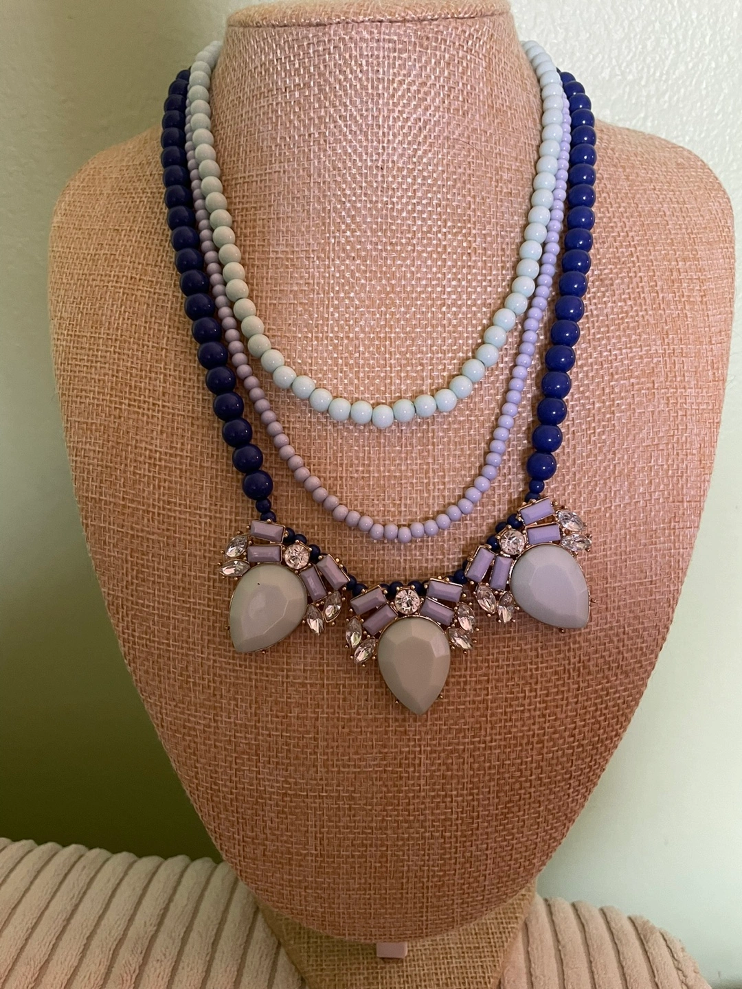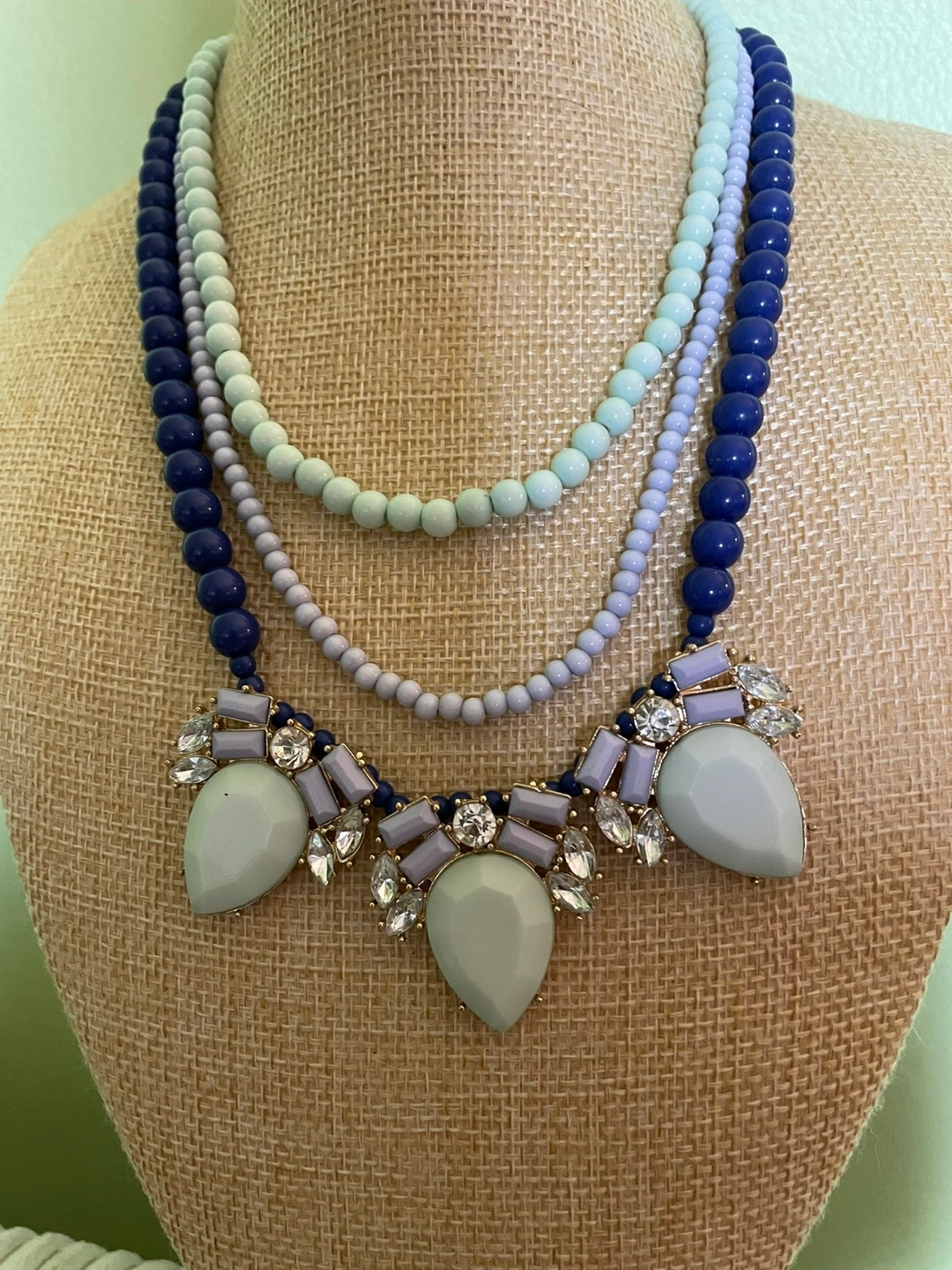 Layered vintage Charming Charlie necklace features blue and lavender beads. Pendant features light grey stones and crystals. Matching light blue beaded bracelet included. Beautiful statement piece.