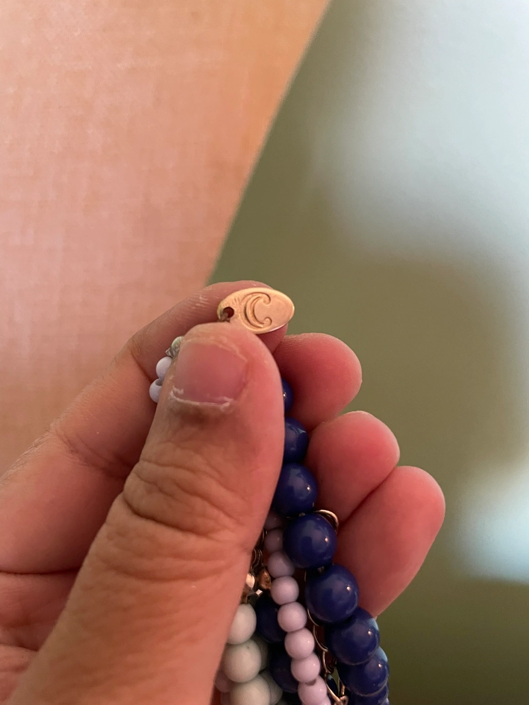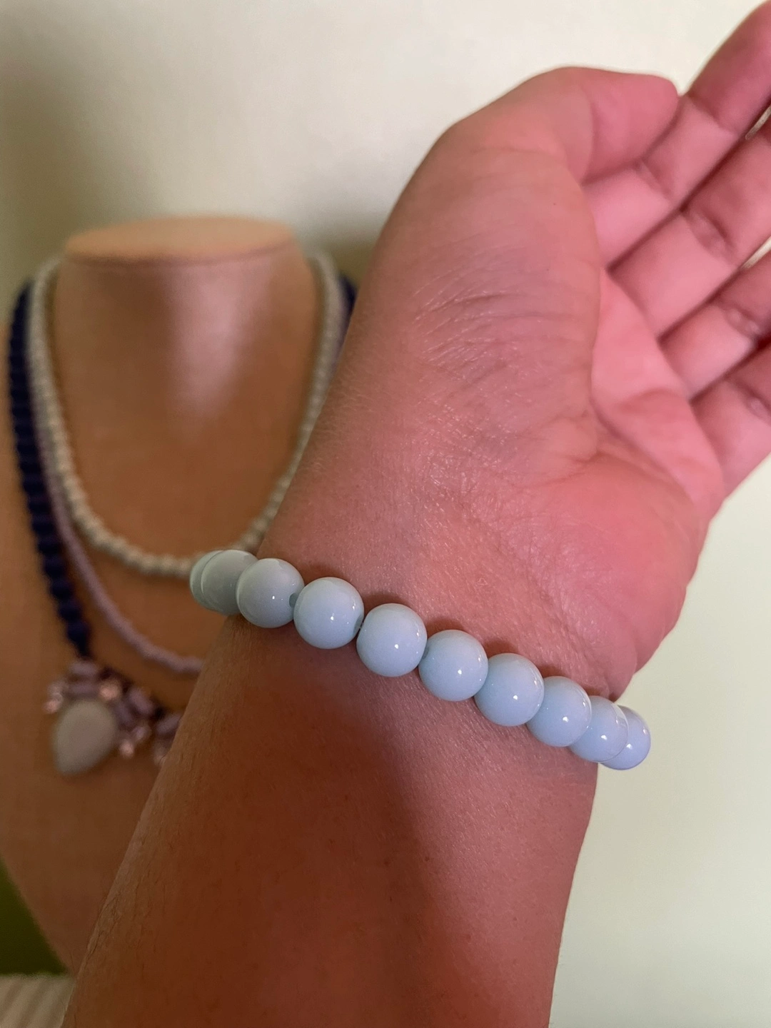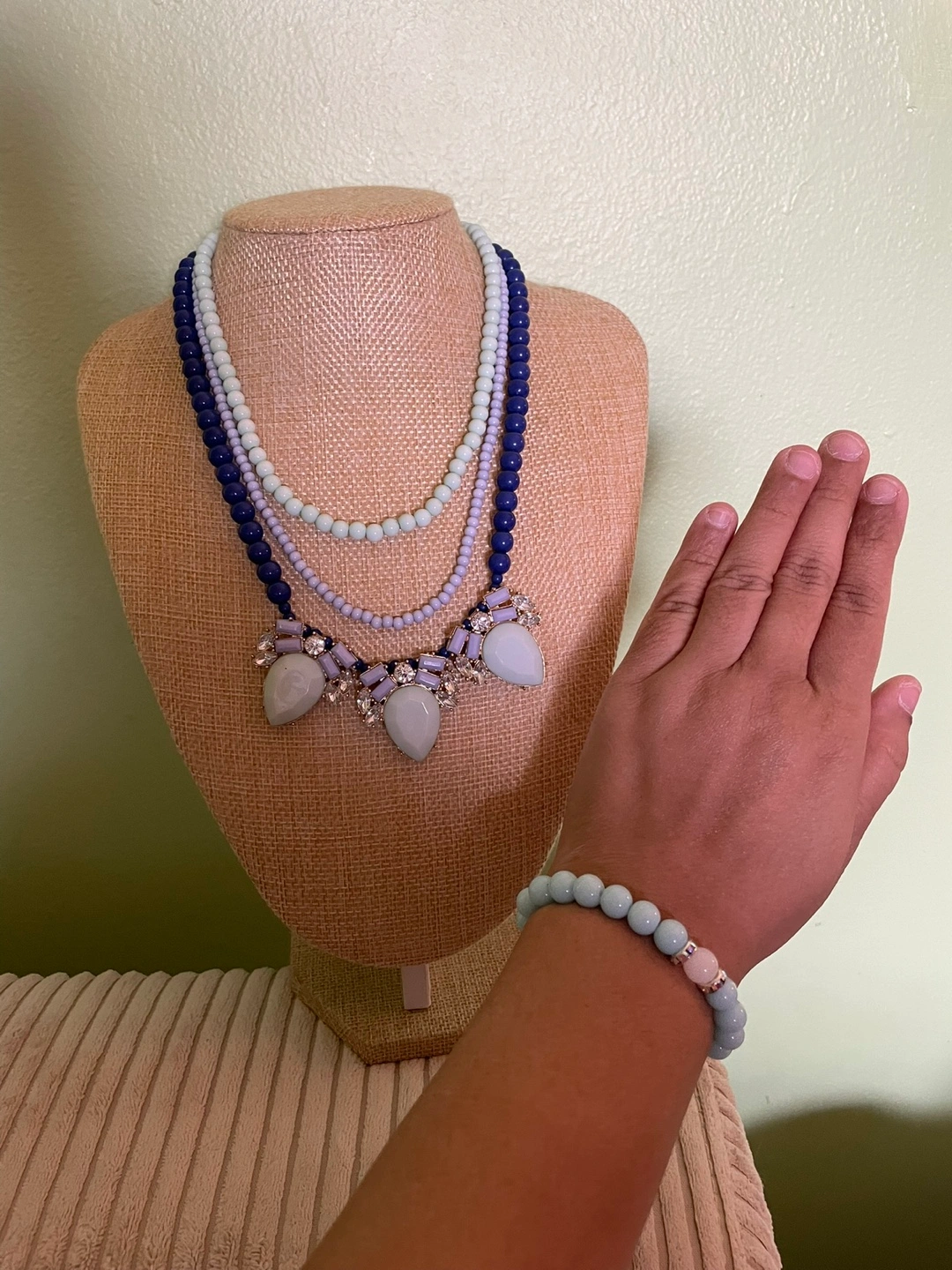 Layered vintage Charming Charlie necklace features blue and lavender beads. Pendant features light grey stones and crystals. Matching light blue beaded bracelet included. Beautiful statement piece.