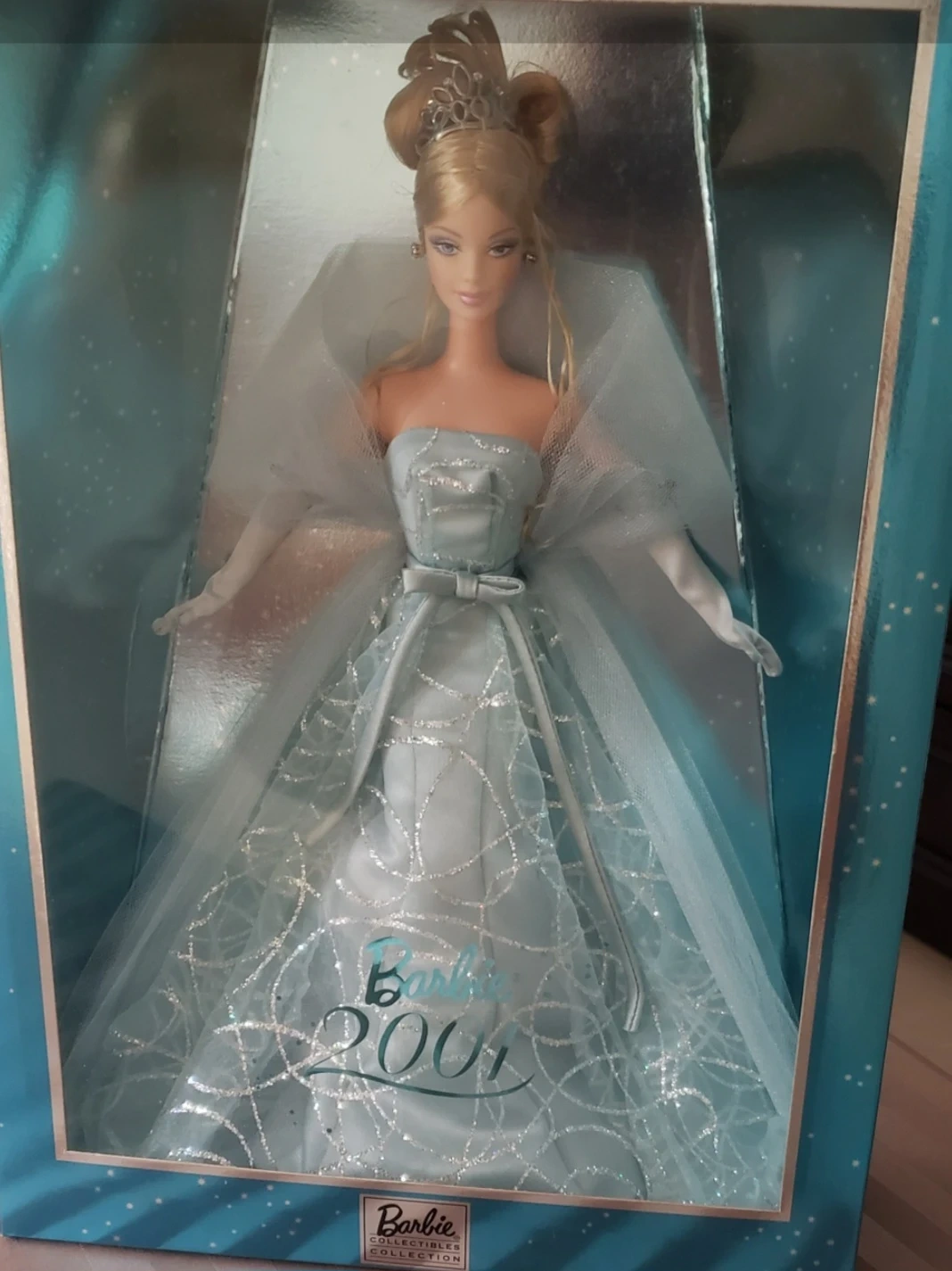 This is a Barbie doll from the Collectibles Collection, released in 2001. It's presented in a light blue gown with sparkly silver accents and a sheer overlay. The doll comes in its original box.
