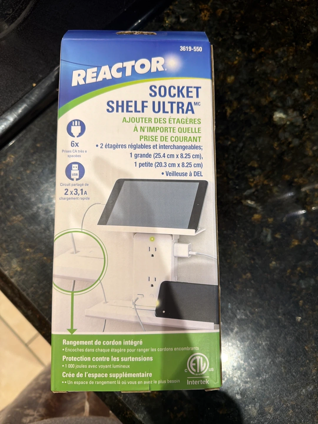 Never been opened. Have one already. This Reactor Socket Shelf Ultra adds shelves and sockets to any outlet. It's ideal for organizing your devices and keeping them charged. It includes 6 AC outlets and 2 USB ports. Porch pickup