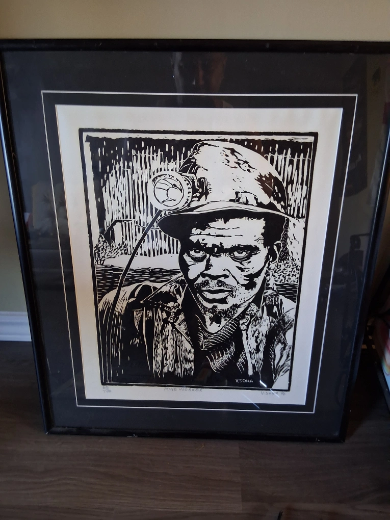 Selling a framed print titled 'Mine Worker' by V.Soha. The print is a black and white linocut style, depicting a miner. It is numbered 66/100.
