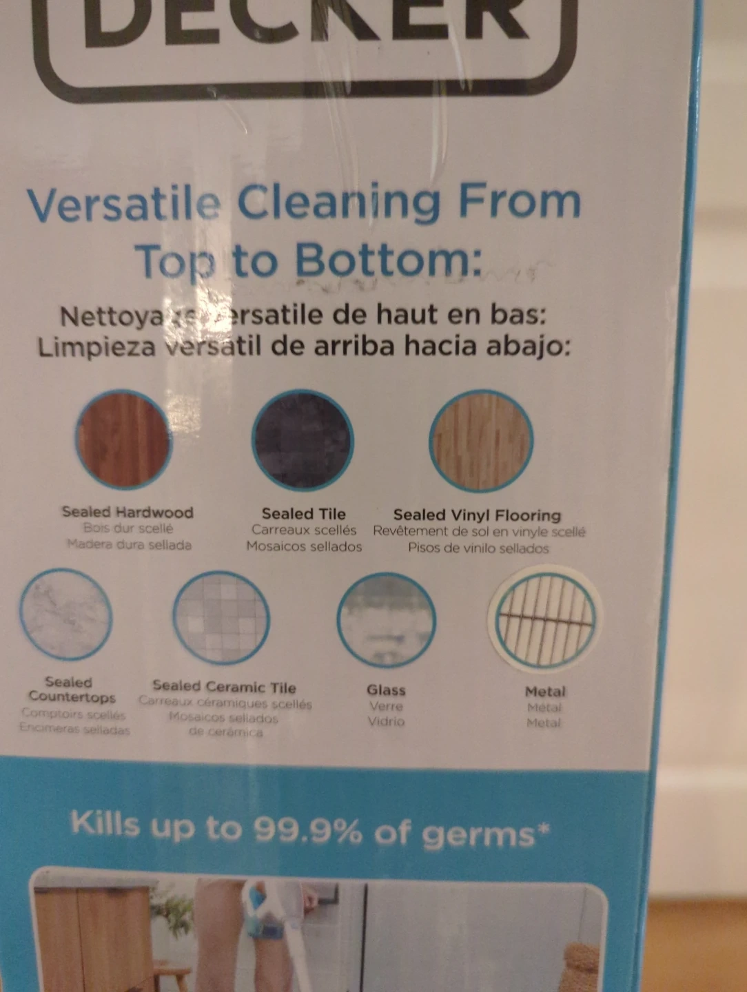Multipurpose steam cleaning system from Black+Decker. It kills up to 99.9% of germs. Includes a floor extension and interchangeable attachments. New never opened.