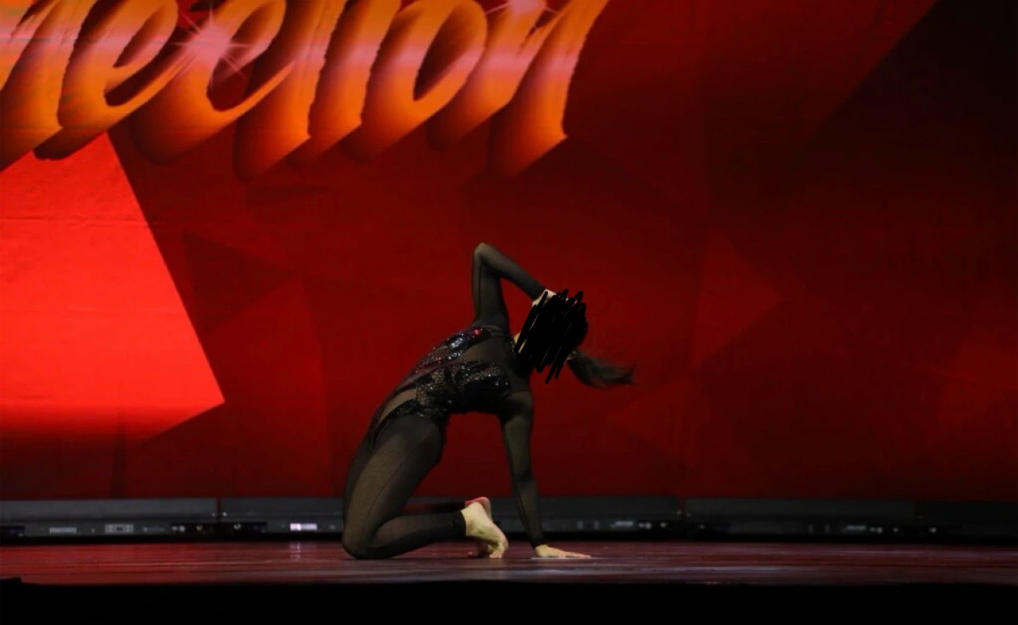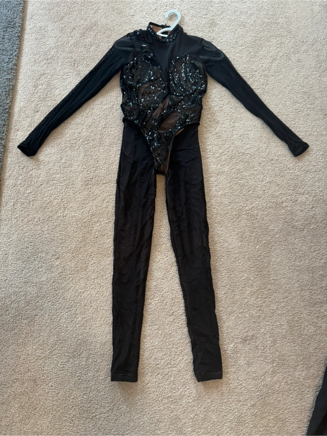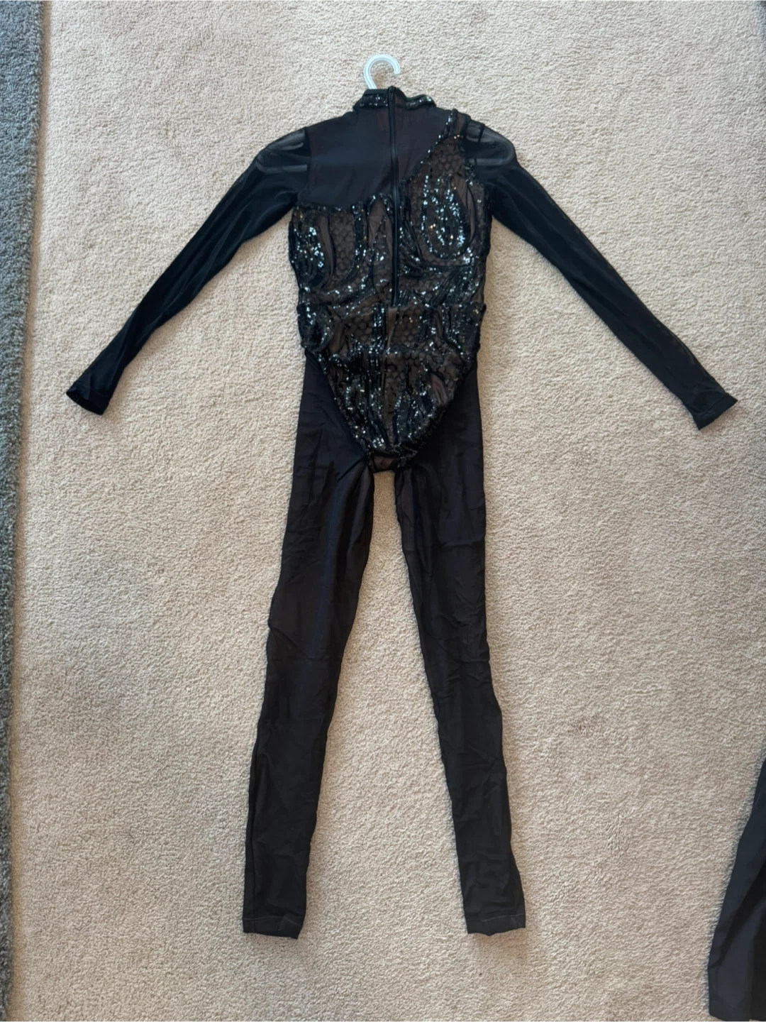 This is a black, long-sleeved dance costume. It features a sparkly sequined bodice with sheer mesh accents and attached tights. Perfect for performances!