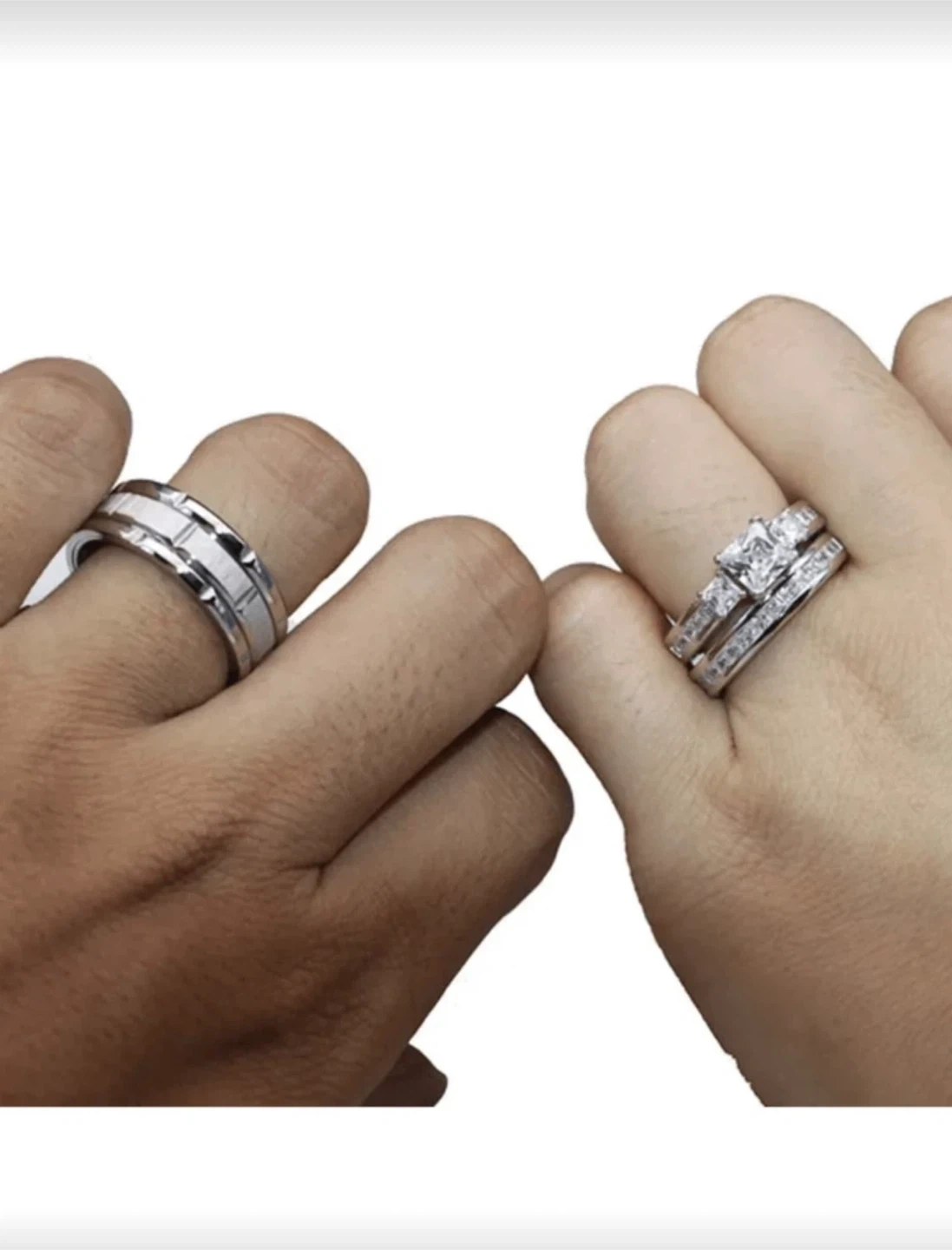 This wedding ring set includes a men's tungsten carbide band and a women's three-piece bridal set with princess-cut and pave stones. The men's ring is stainless steel with a brushed and polished finish. The women's rings are silver-toned with clear stones, designed to be worn together.