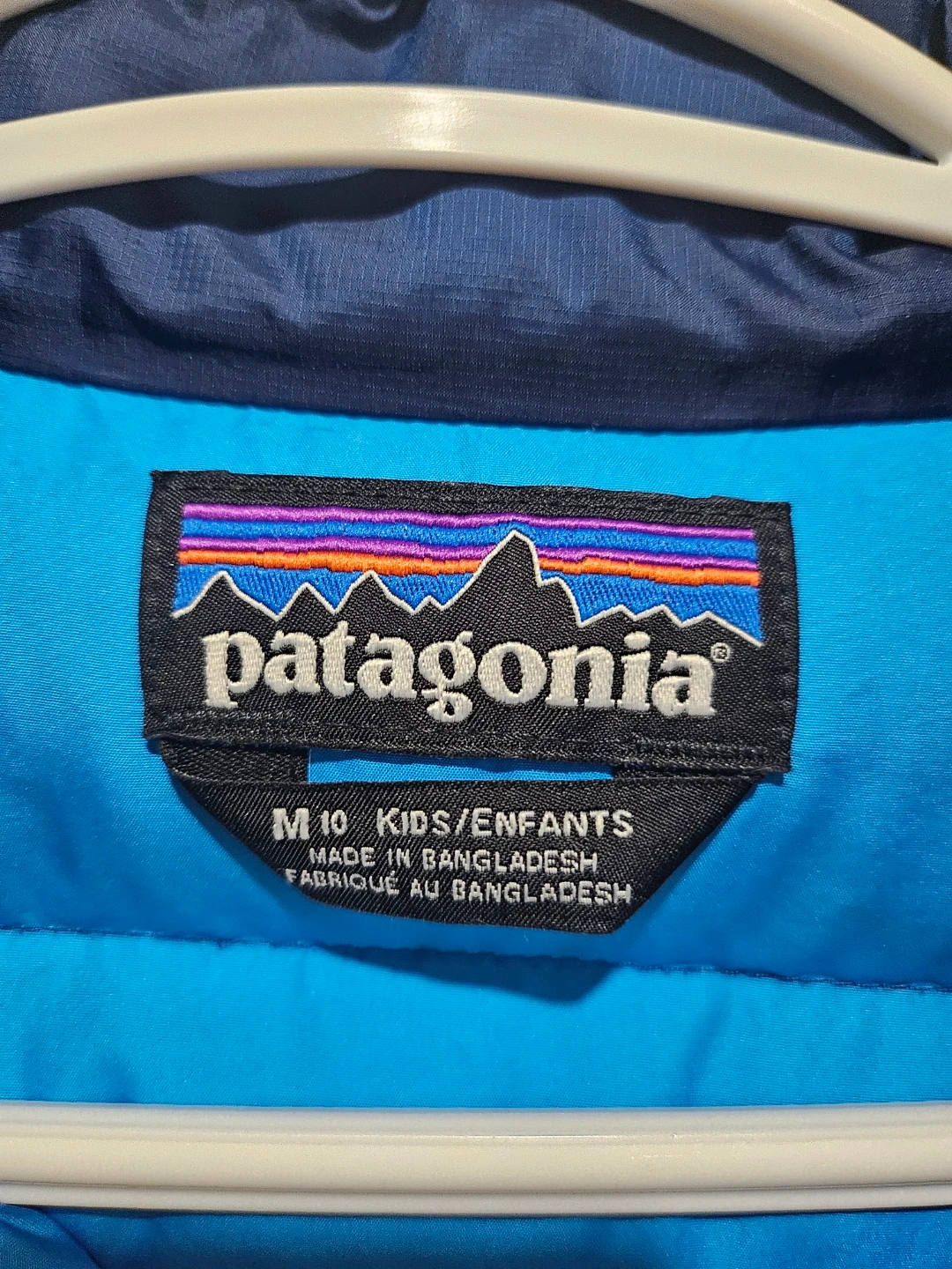 This is a kids' puffer jacket from Patagonia in blue. It's a size medium, equivalent to a kids' size 10. Made in Bangladesh. Perfect for staying warm on cooler days!