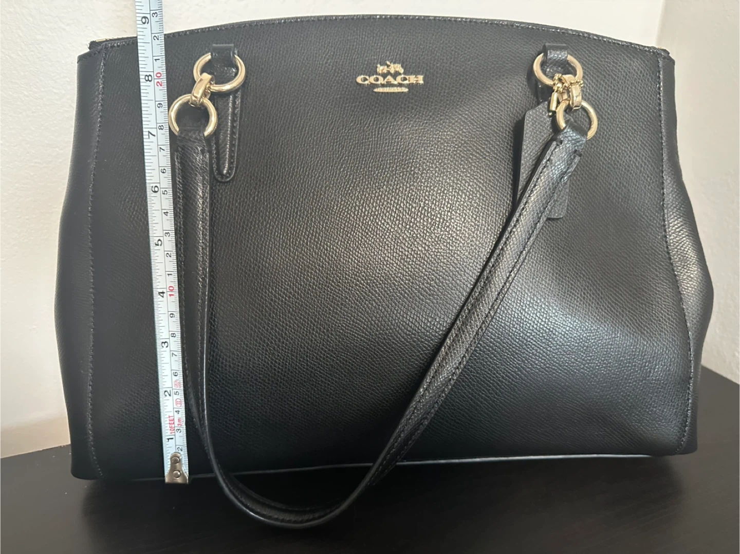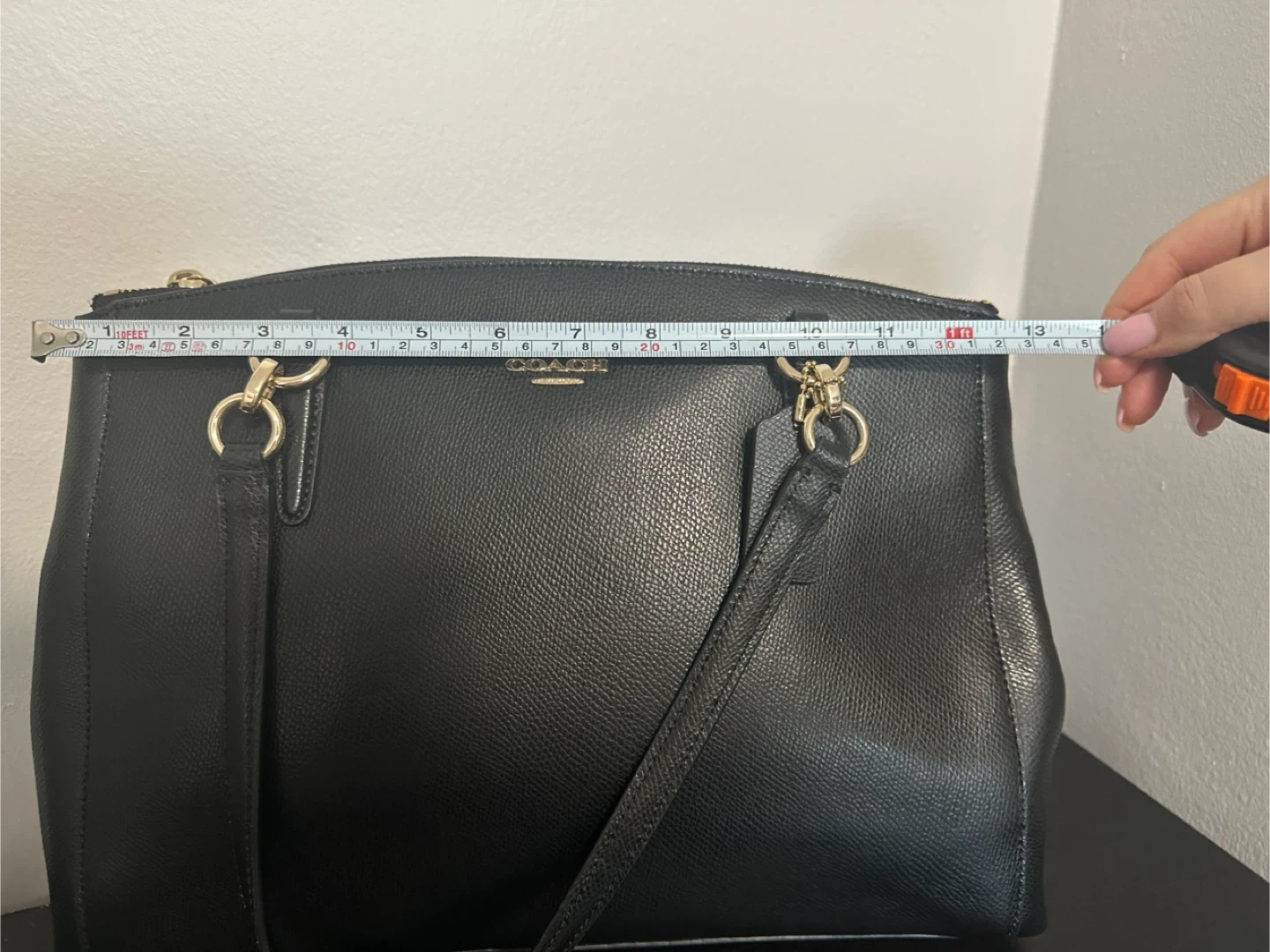 This is a black leather Coach tote handbag. It measures approximately 13 inches wide and 9 inches tall. This bag is a classic accessory for everyday use.