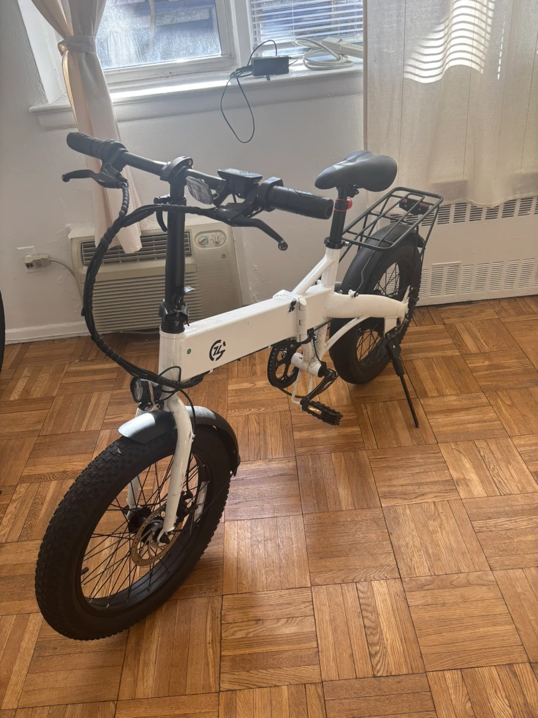 Selling a white electric folding bike! It's perfect for commuting or leisurely rides around the neighborhood. It features fat tires and a rear rack for carrying items. This e-bike actually cost me $650 but it has electrical problems that need to be addressed. I’m selling this foldable E-bike and another e-bike which also needs electrical work. Contact me immediately and we can work something out. They both need subtle electrical work but are perfect for commuting!