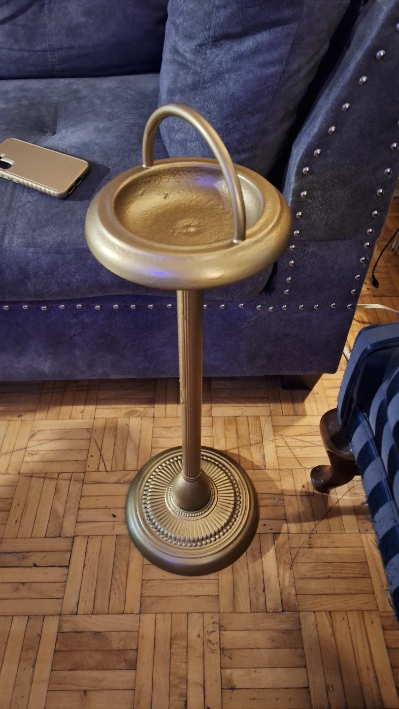 A stylish vintage ashtray stand with a gold finish. It's designed to hold an ashtray and has a convenient handle. Perfect for a den or living room!
