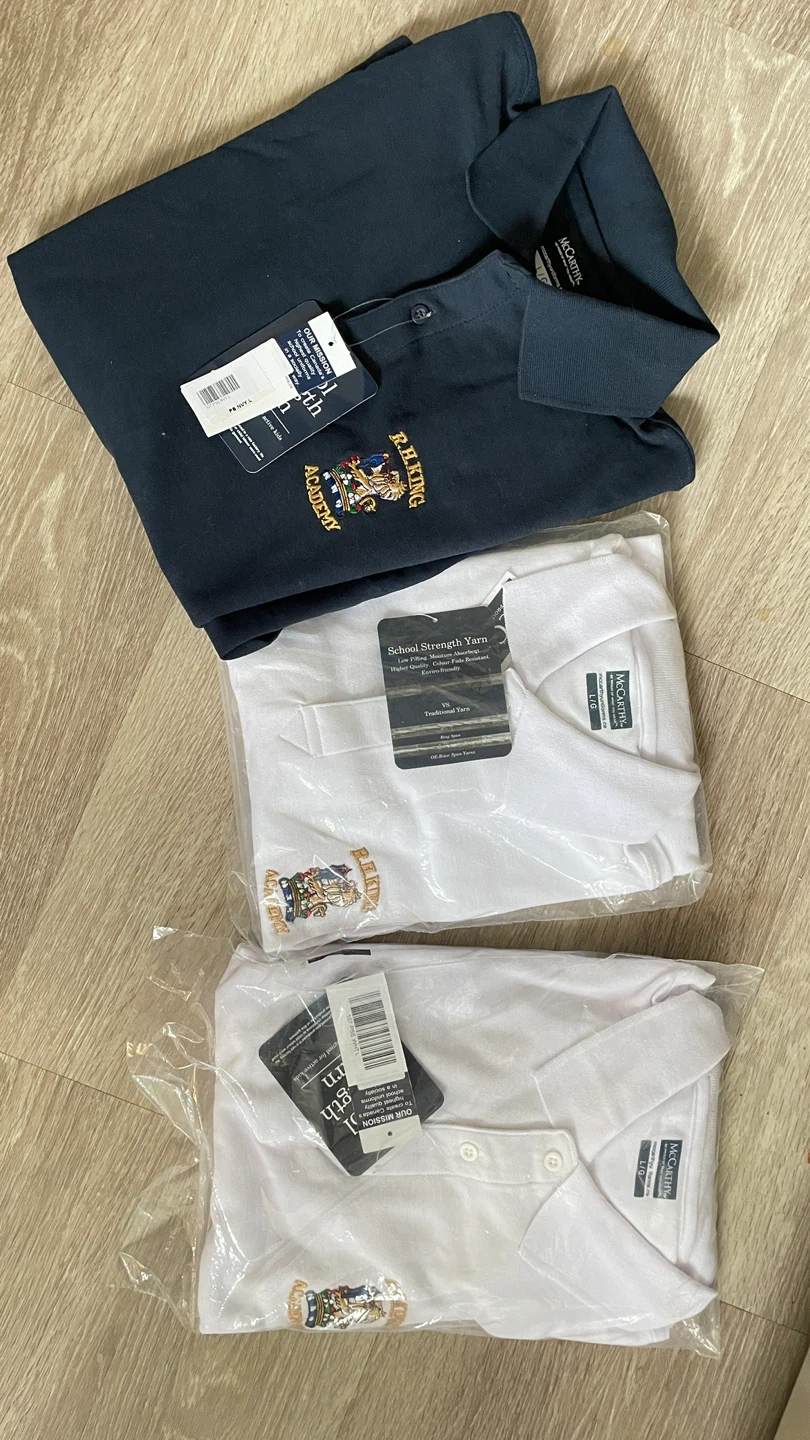 Two new white polo shirts and one navy polo shirt. Made with School Strength Yarn, specially designed for active kids. These shirts feature a RH King school crest. Bought before the uniform was voted out. It's great for school uniforms!