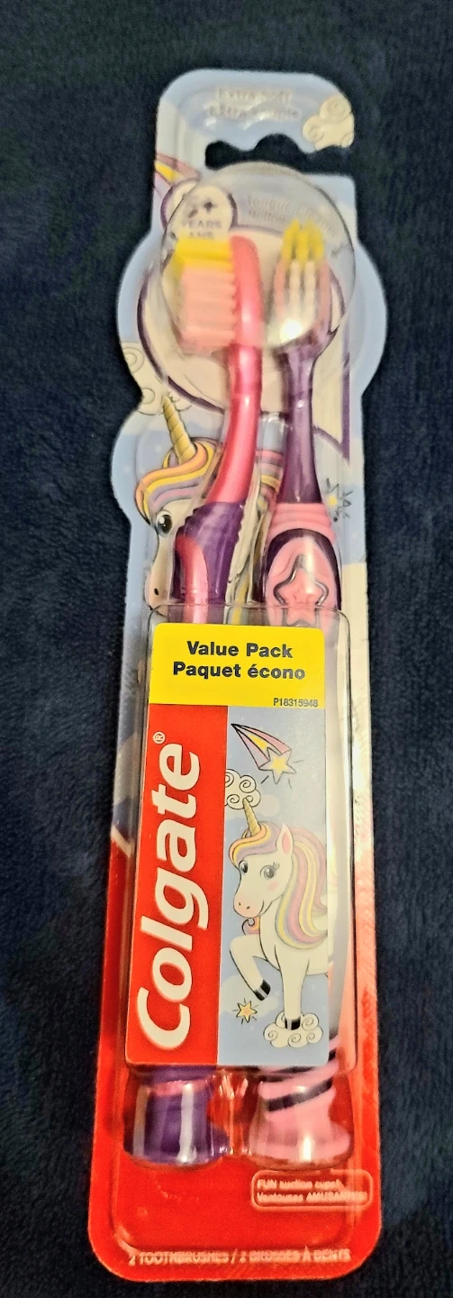 This value pack includes two Colgate toothbrushes designed for kids. They're extra soft with fun suction cups. Perfect for little ones learning to brush!