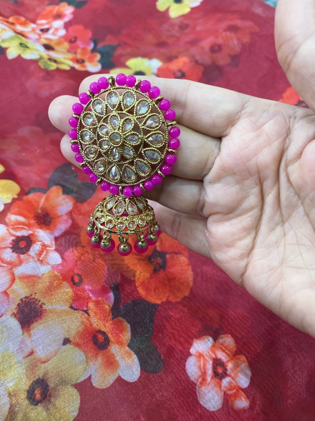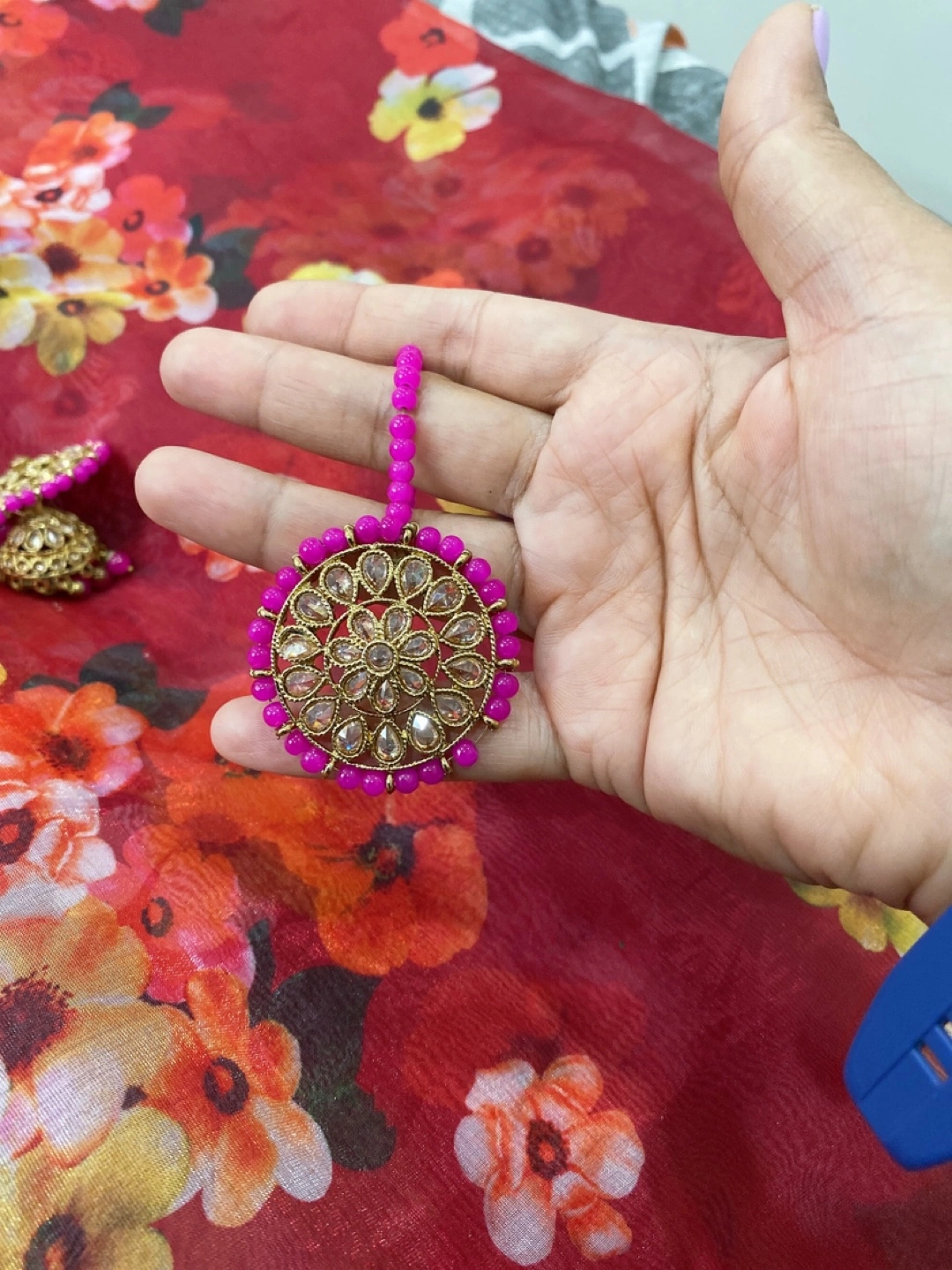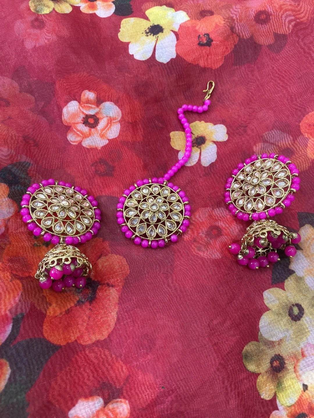 Beautiful Indian-style jhumka earrings with matching tikka set. The earrings are a lovely gold colour with pink bead accents. Perfect for adding a touch of elegance to any outfit!