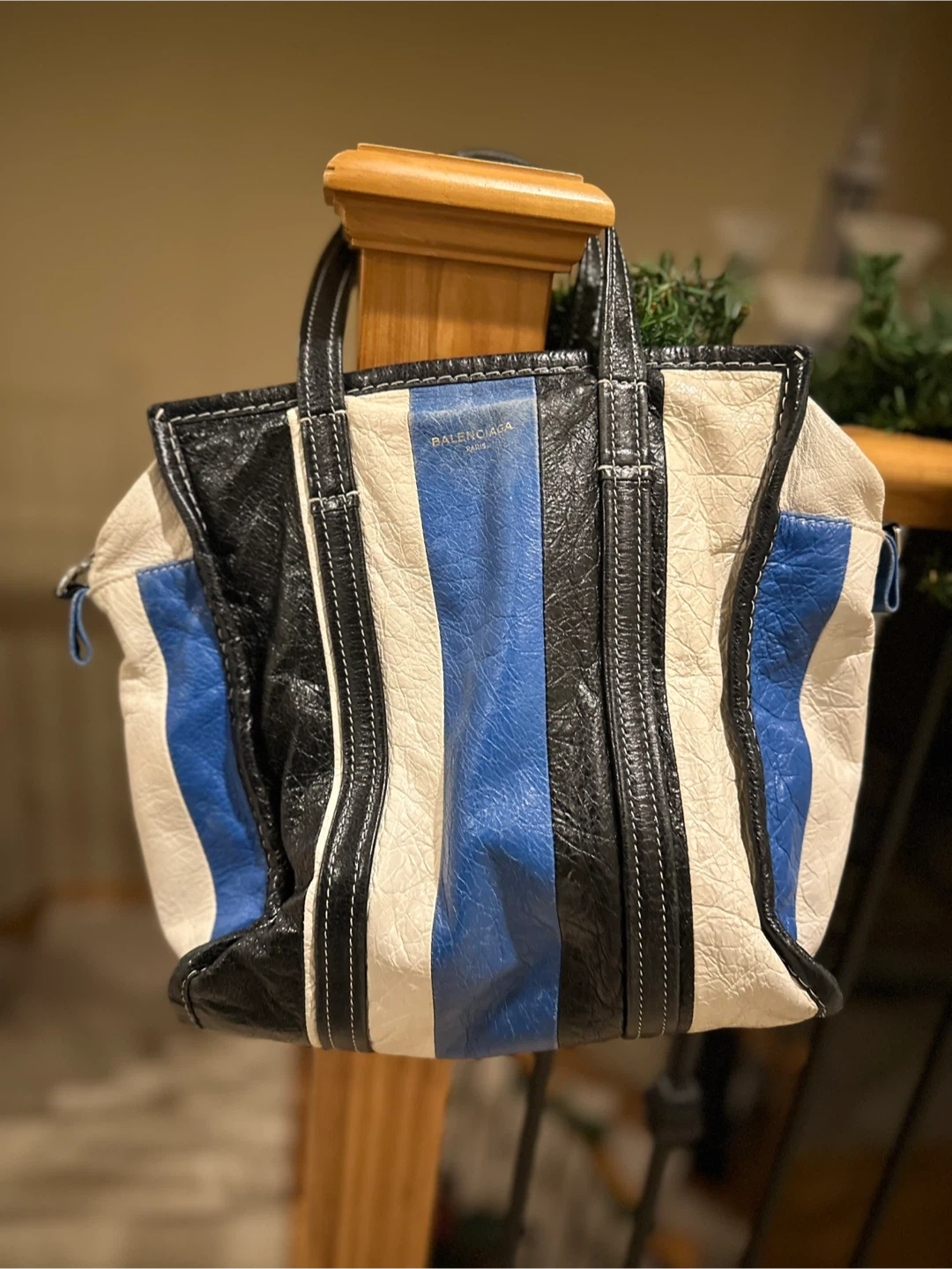 This is a Balenciaga Cabas tote bag. It features a striped design in black, white, and blue. It's a stylish and practical bag for everyday use