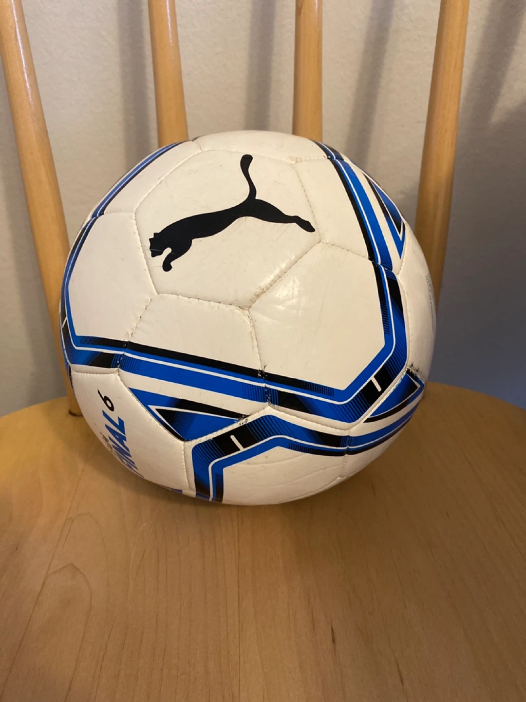 This is a Puma soccer ball in white with blue and black accents. It's suitable for recreational play. The size appears to be standard for adult use.