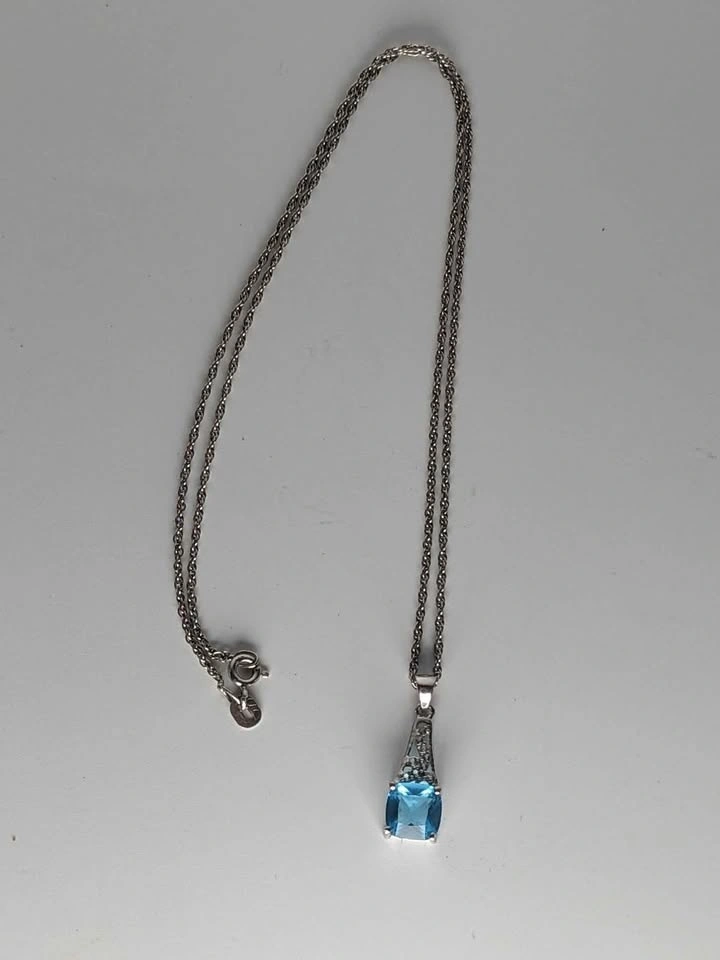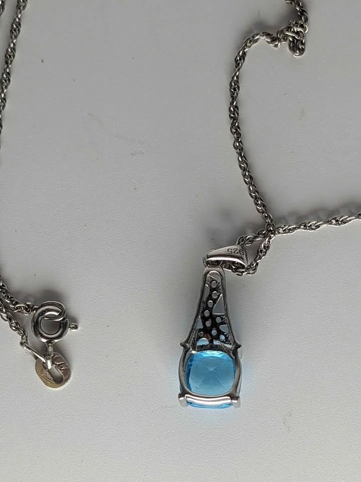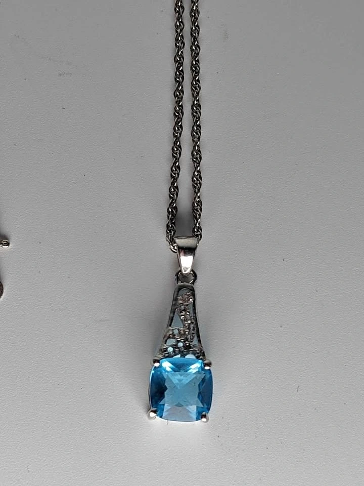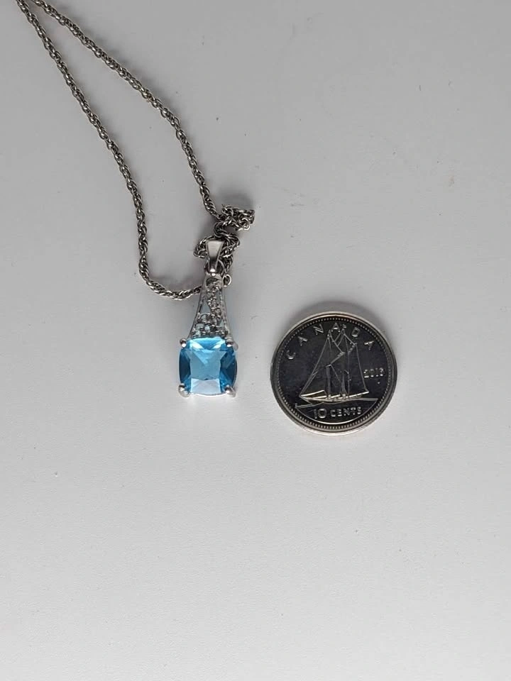 Elegant and eye-catching pendant featuring a 1.65ct faceted natural blue quartz gemstone set in sterling silver (1.45g), enhanced with rhodium plating. The silverwork includes clear accent stones. Suspended from an 18" sterling silver chain. Total weight approx. 3.05g. New/Unworn. Public pick up in Seba Beach Drayton Valley or Spruce Grove Alberta. I accept cash etransfer debit Visa or MasterCard