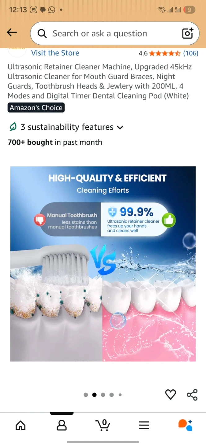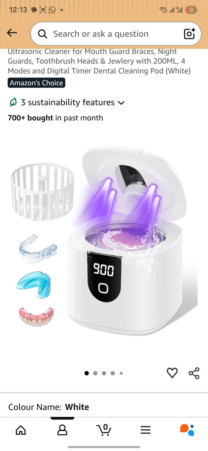 This ultrasonic cleaner uses 45kHz technology and UV light for deep cleaning. It holds up to 200ML and has 4 cleaning modes with a digital timer. It's great for retainers, mouth guards, toothbrush heads, and jewellery.