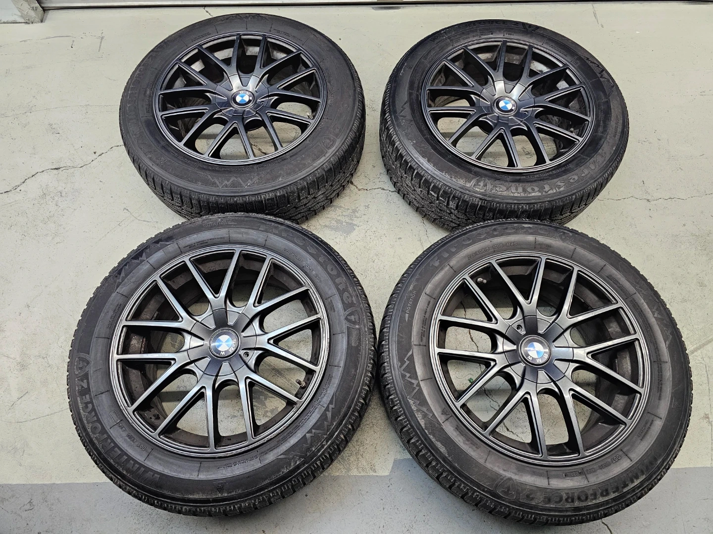 Set of 4 18" Firestone winter tires on alloy rims 225/60 R18 used on BMW X1/X3. Rims are replica and in good condition, no bend, no cracks, no damage. Tires have lots of thread left, tpms installed. Rims are multi-fit with bolt pattern 5×112 and 5×120
