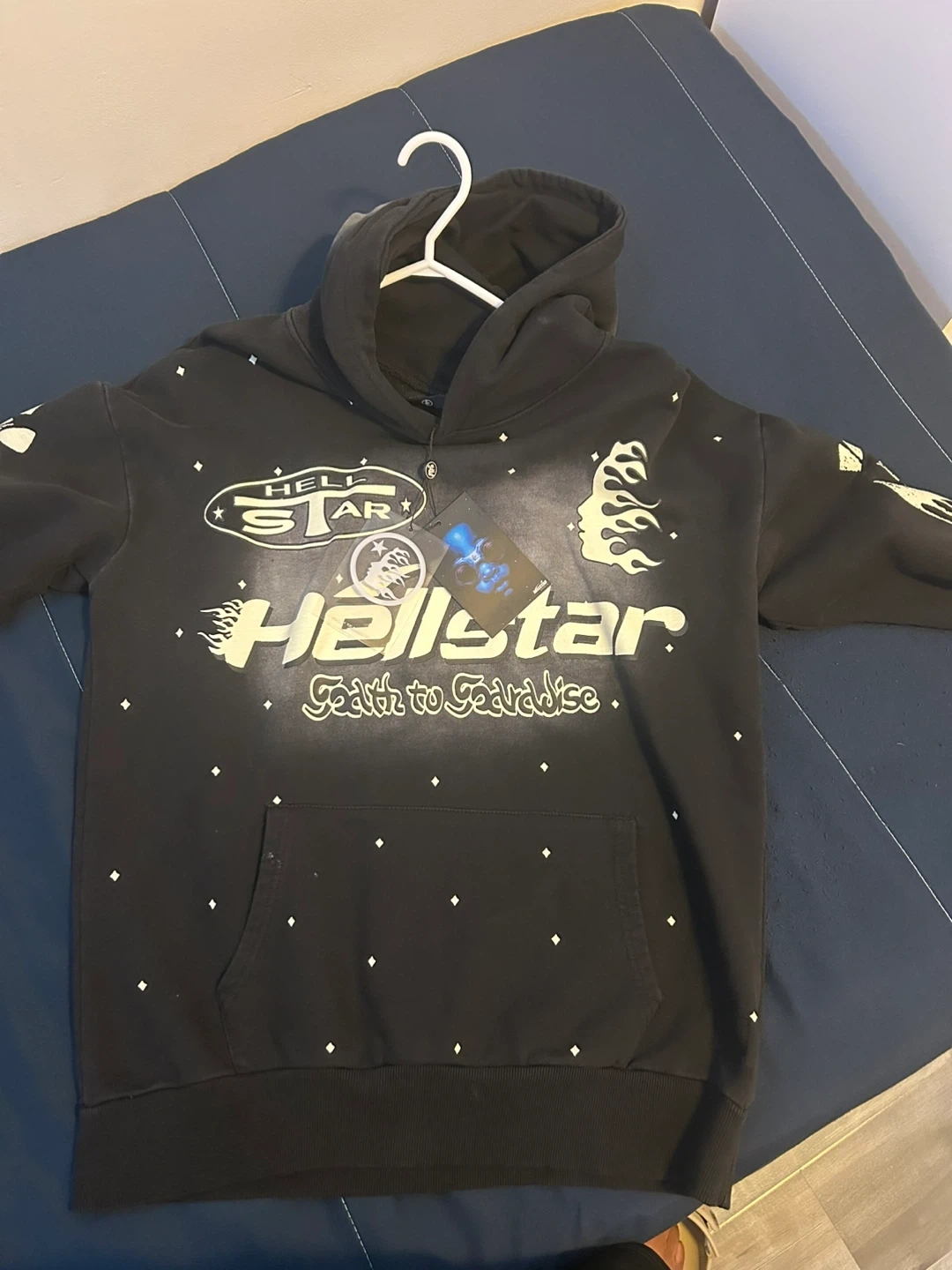 This is a Hellstar hoodie with the "Faith to Paradise" graphic. It features a full-front graphic design and small star accents throughout. The material is a soft cotton blend, perfect for everyday wear.