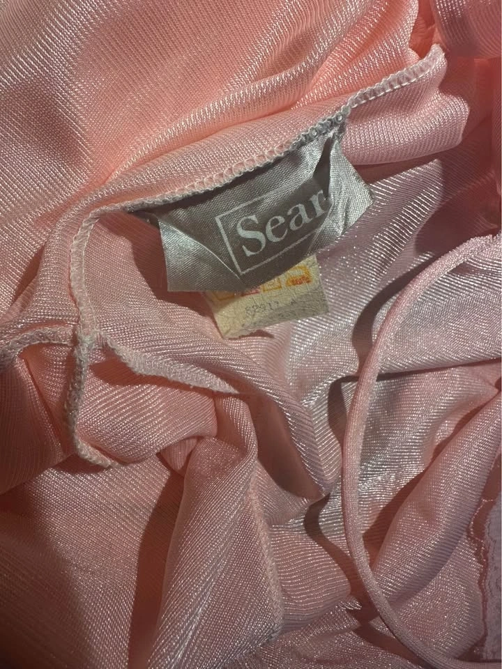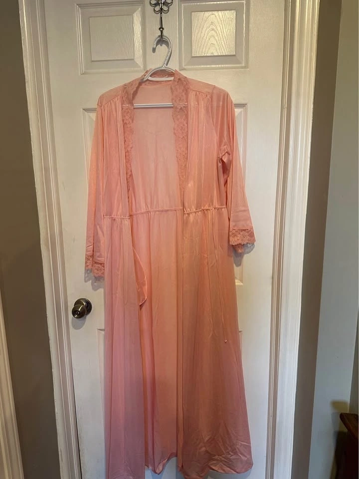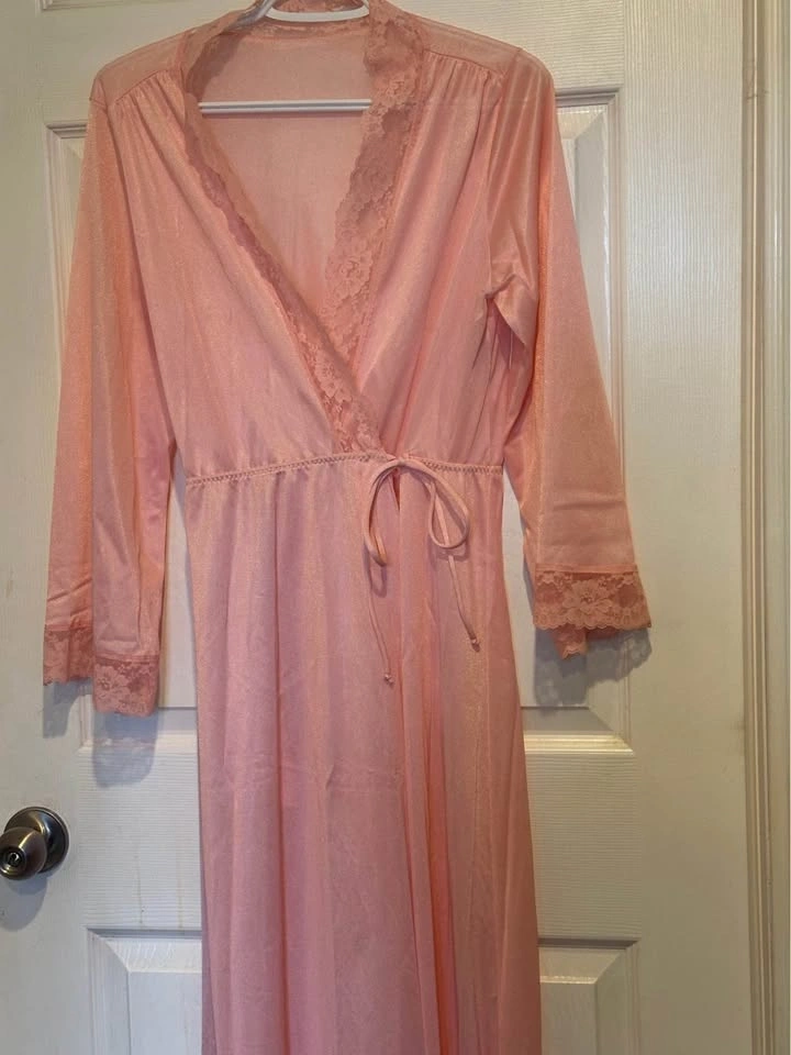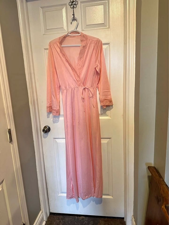 Vintage Sears pink nylon peignoir robe, likely from the late 1960s to the 1970s. Made of sheer nylon chiffon, it's lightweight with a subtle shimmer. Features a V-neck with floral lace trim, long sleeves with lace cuffs, and an empire waist with a drawstring tie. Light pink! Excellent used condition, no rips, tears, or stains. Please look at the photographs. This is a beautiful house coat. Size large. Pick up in Welland. Smoke-free, pet-friendly home. Please take a look at my other items posted, thank you.