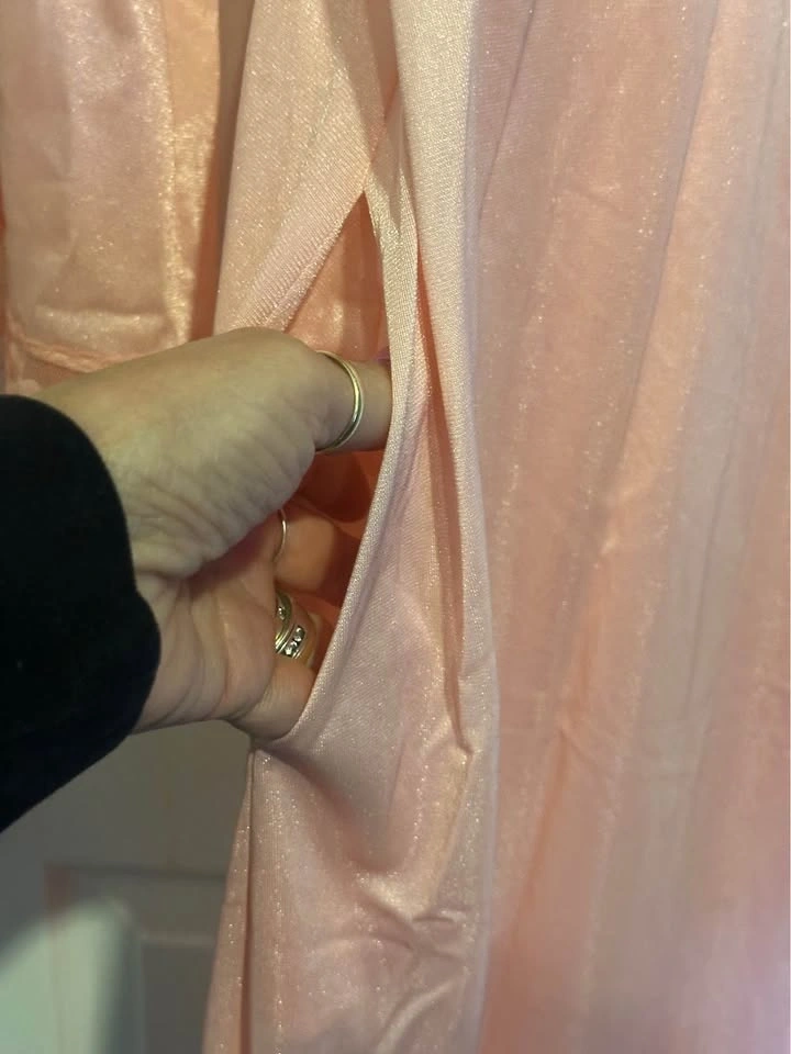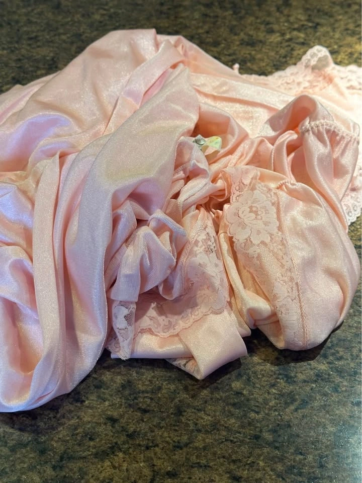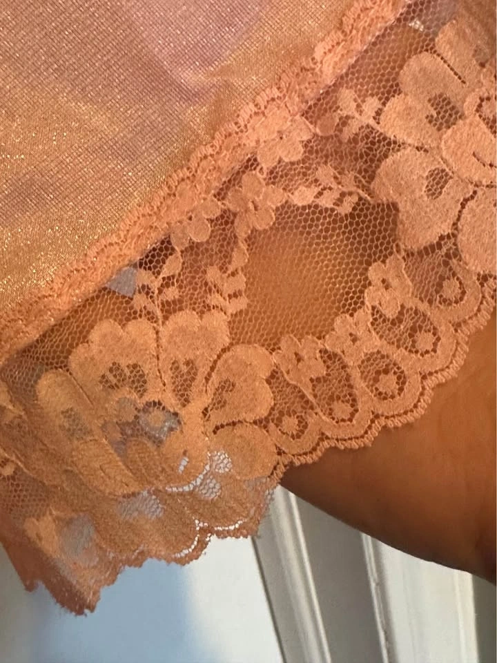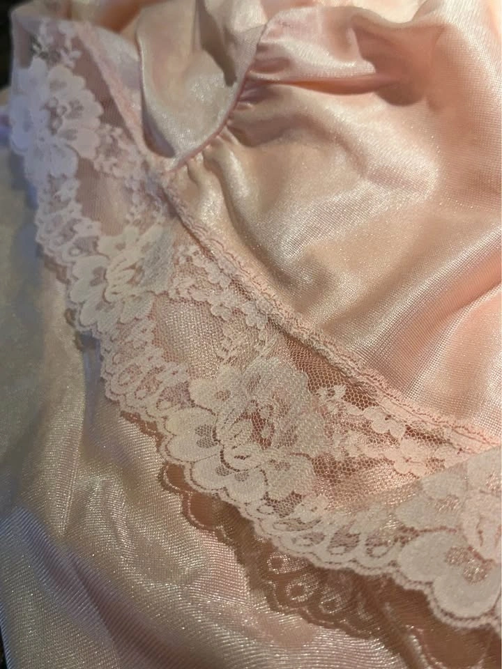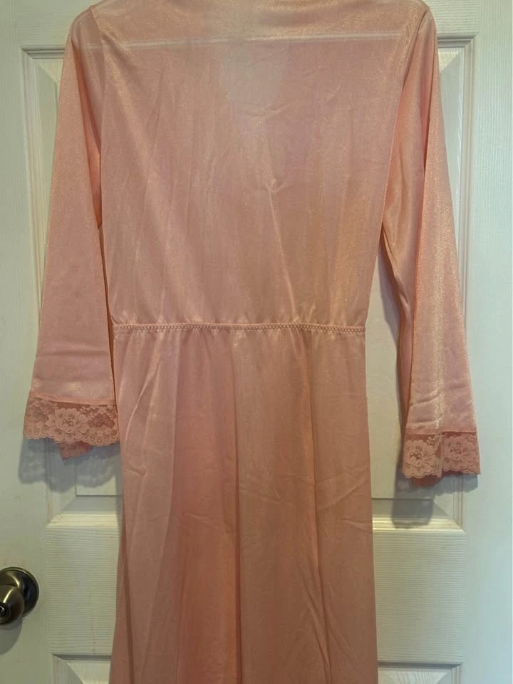 Vintage Sears pink nylon peignoir robe, likely from the late 1960s to the 1970s. Made of sheer nylon chiffon, it's lightweight with a subtle shimmer. Features a V-neck with floral lace trim, long sleeves with lace cuffs, and an empire waist with a drawstring tie. Light pink! Excellent used condition, no rips, tears, or stains. Please look at the photographs. This is a beautiful house coat. Size large. Pick up in Welland. Smoke-free, pet-friendly home. Please take a look at my other items posted, thank you.