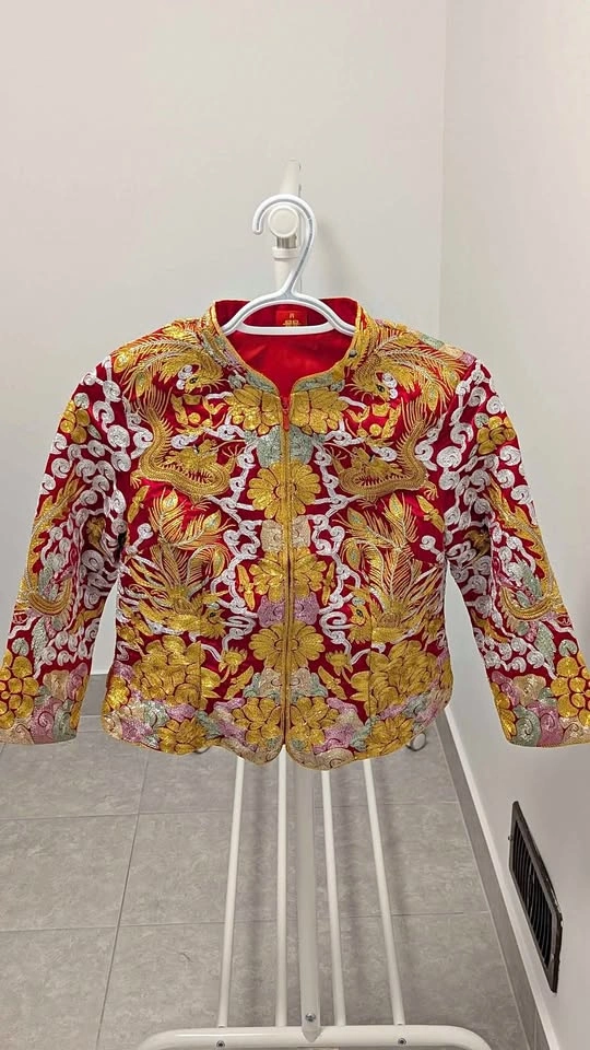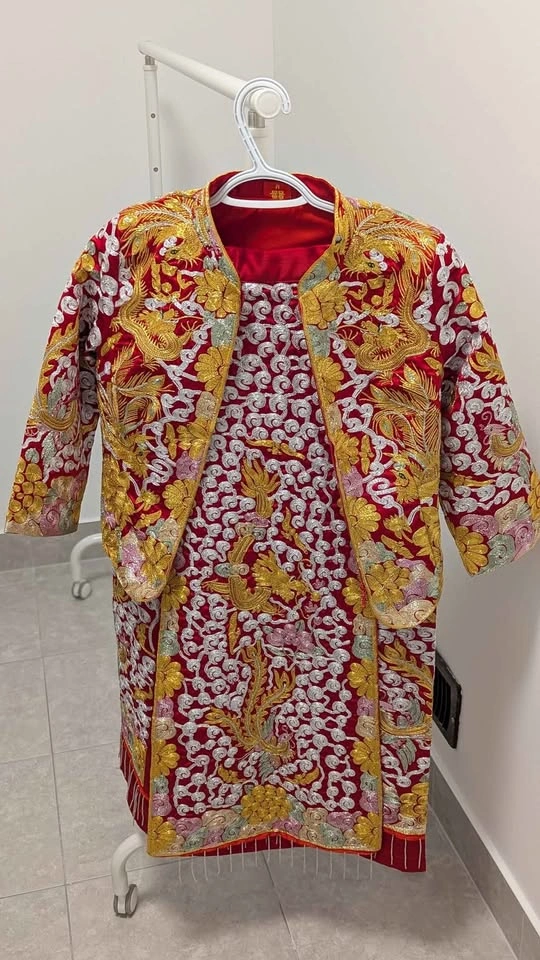 Traditional Chinese wedding dress in red. Worn indoor for a couple of hours only. In good condition with no stains or tears/rips. Has been cleaned with an alcohol spray and steam iron. Top piece zips up in the middle. Bottom piece has a zipper and velcro with a stretchy waist. Size is medium, but fits more like a North American size 0 to 2. Will throw in some head pieces (cleaned and disinfected) for free as well. Please dm for specific measurements of the dress that you'd like. If interested, please check my page for traditional Chinese bridal shoes as well. Pick up in Markham (near Wismer Commons) and cash only, thank you.