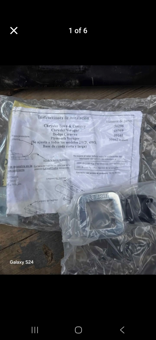 Selling a Reese Towpower hitch, compatible with Chrysler Town & Country, Chrysler Voyager, and Plymouth Voyager vans. Includes installation instructions and hardware. Part numbers are 36296, 06369, and 39692. The hitch is black and appears to be in good condition. Trailer hitch mount for vehicle never been installed, vehicle make and model info is in second picture, it still has original installation & instructions kit.