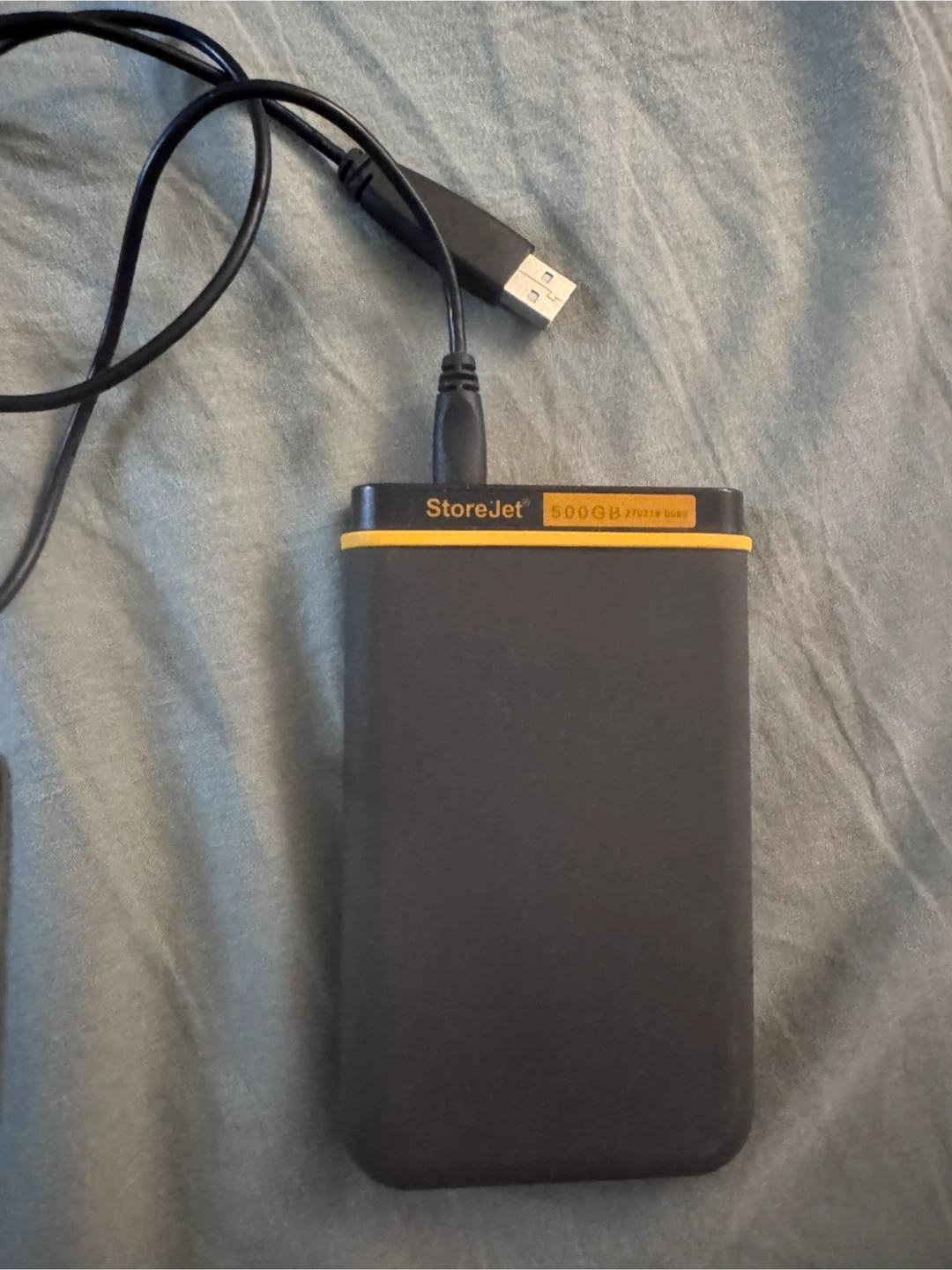 Selling a Transcend StoreJet 500GB external hard drive! It's in great shape and comes with the necessary cable. Perfect for backing up your files or extra storage on the go