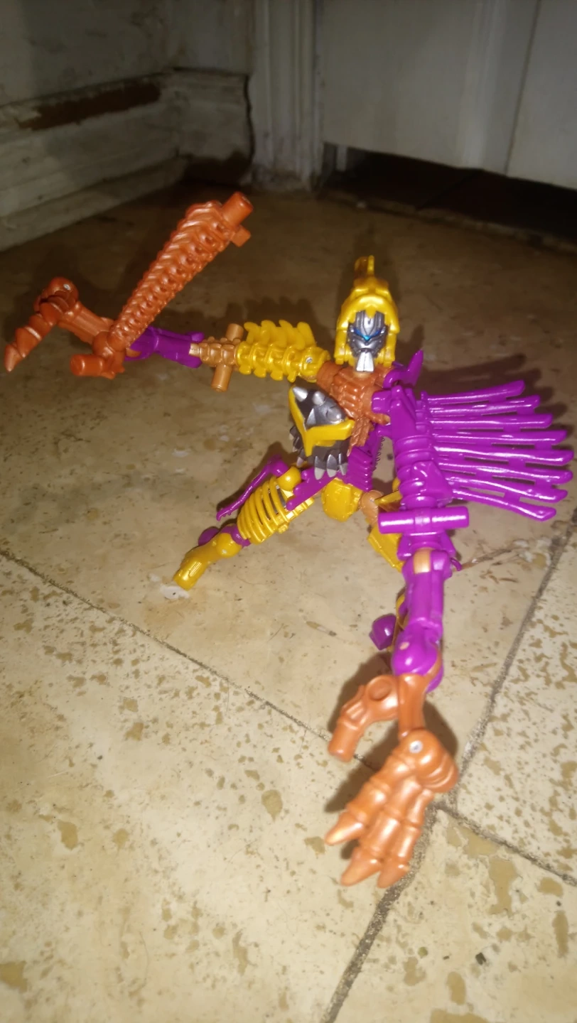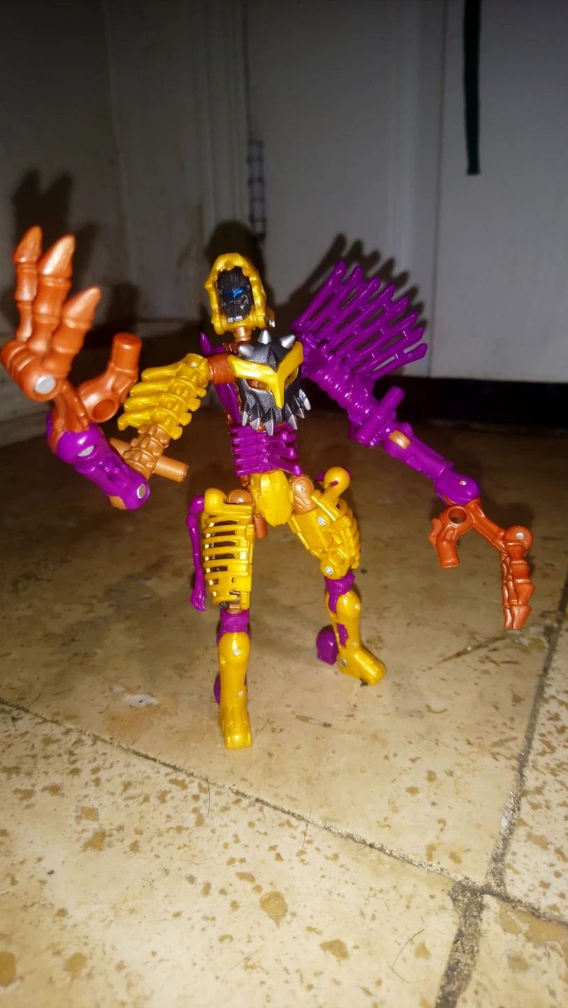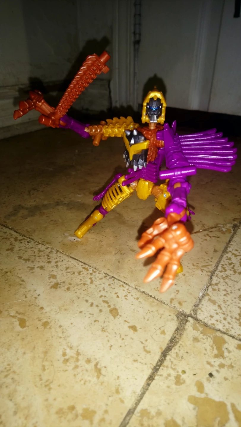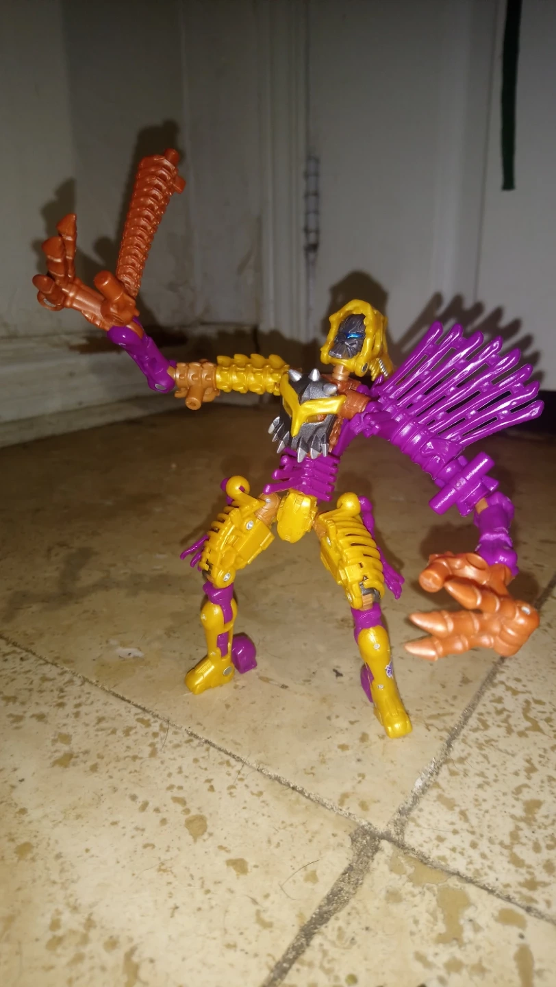 60Selling a Transformers Beast Wars Dinobot toy. It's in good condition and ready for a new home! Features a unique design with purple, gold, and brown colours.